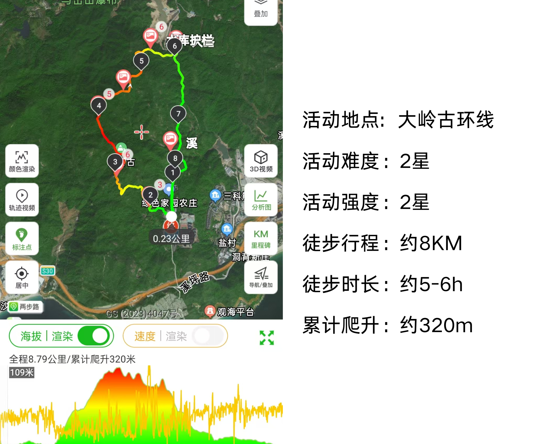 全程约8公里,爬升约320米,由土路,台阶,密林(㓊背村一坪山诗步作步道一马峦山大瀑布一庚子首义旧址一大岭古一洞背村)