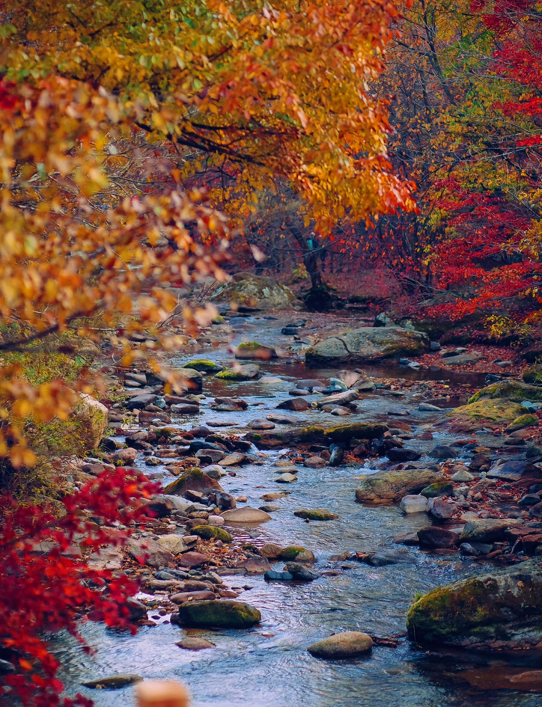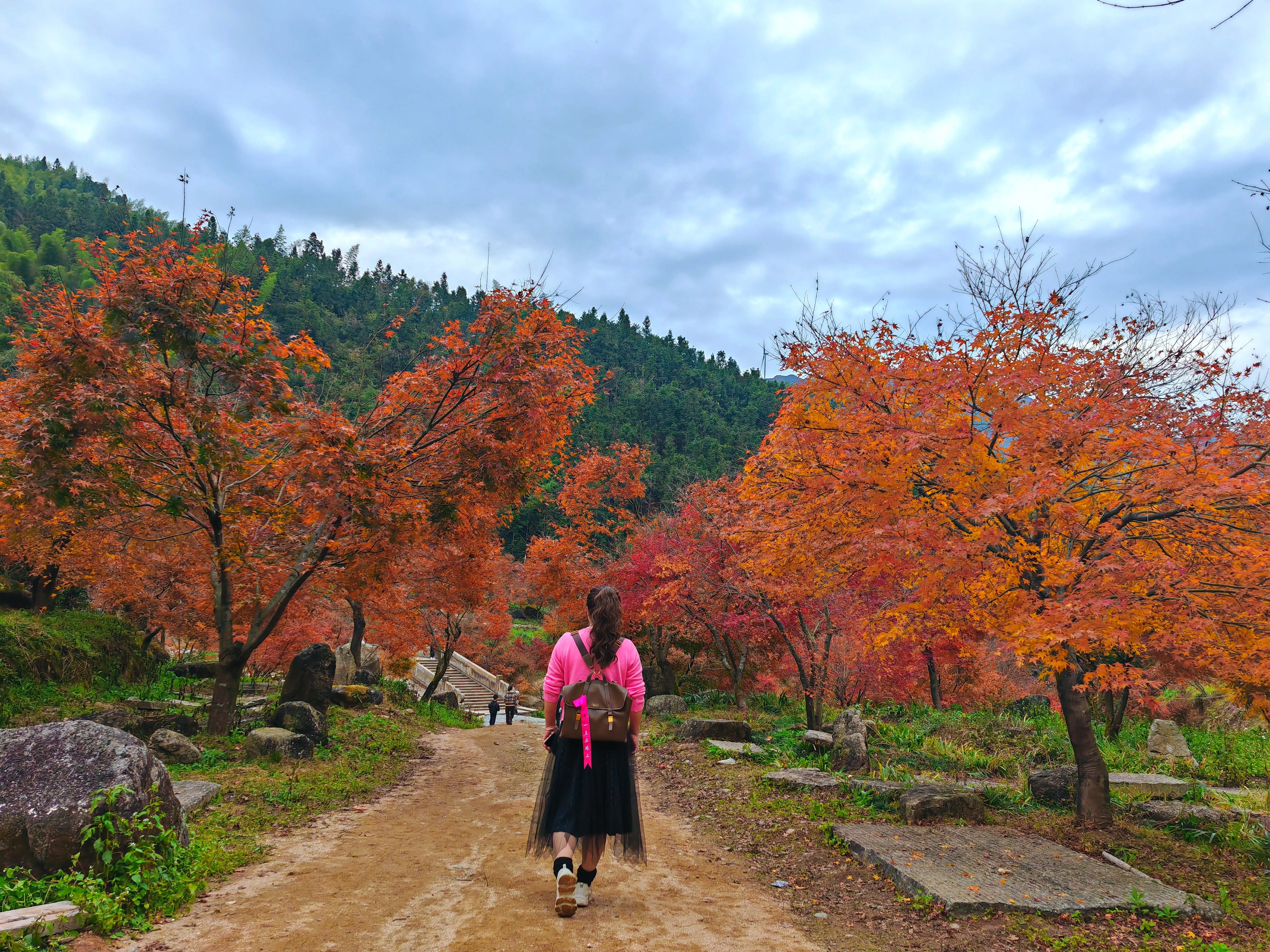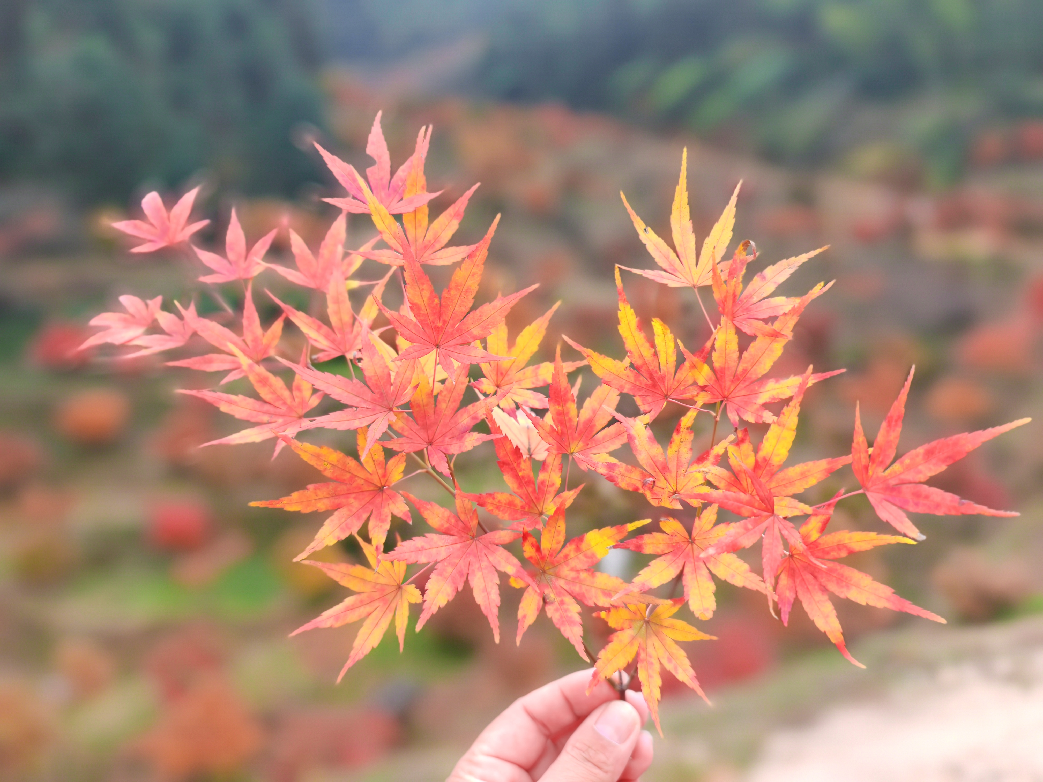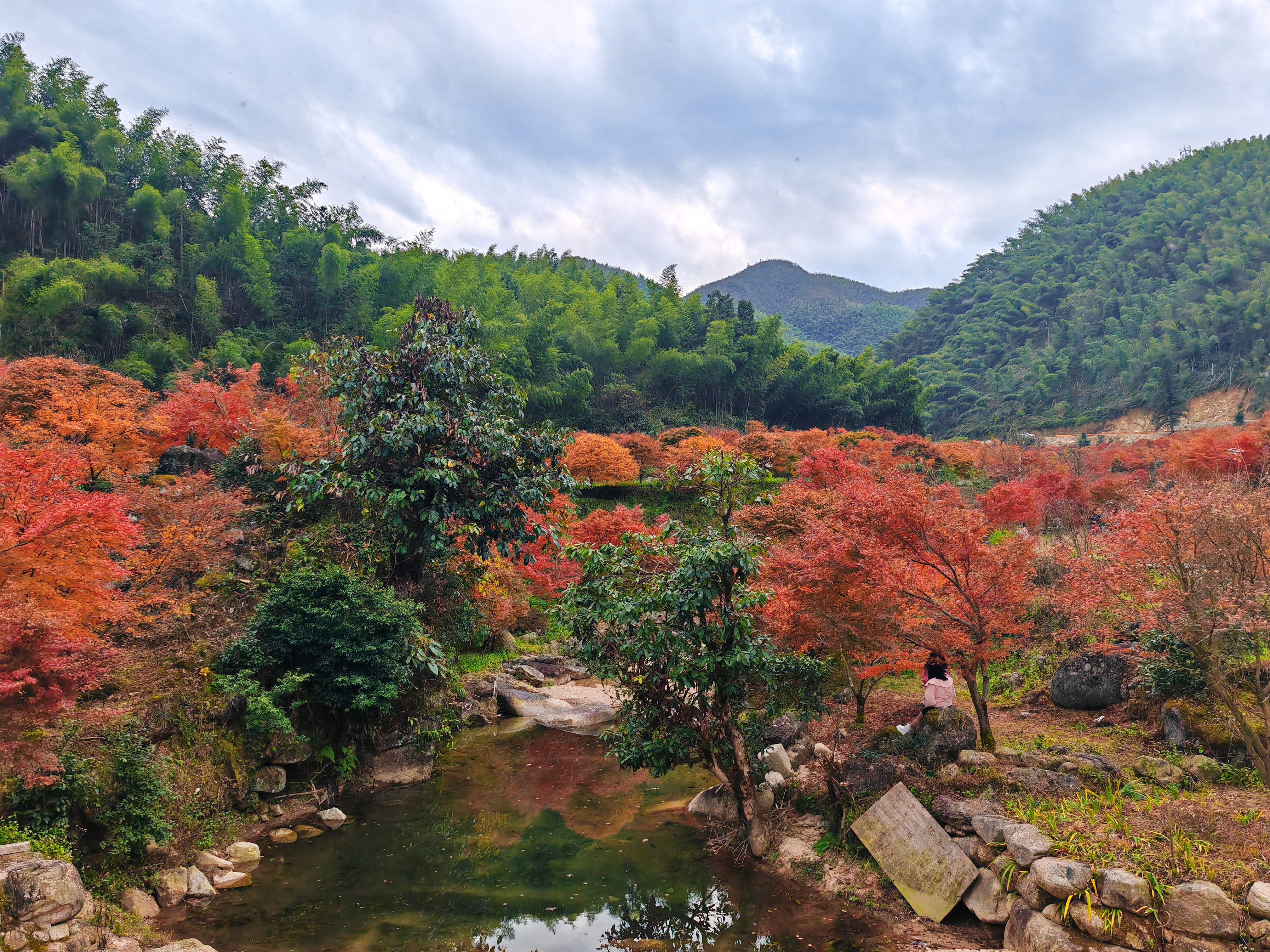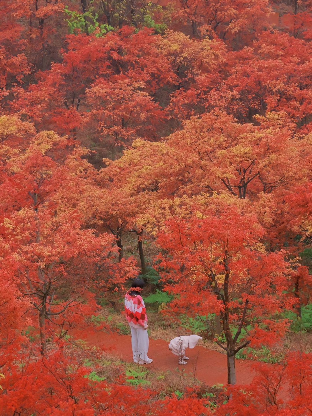 漫山的枫叶里,深红、粉红、橙红、橘红,层次分明