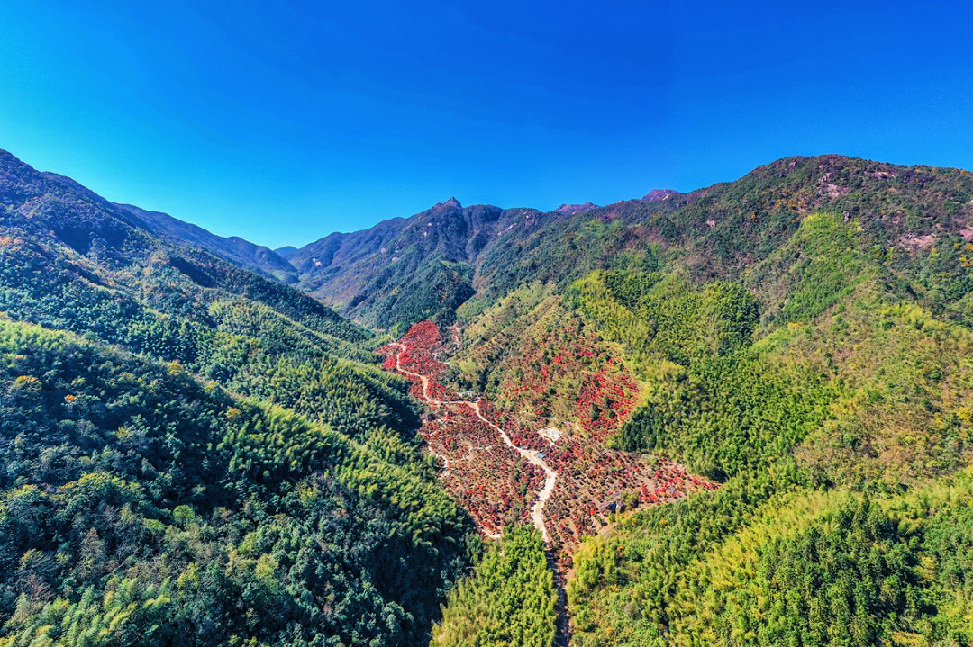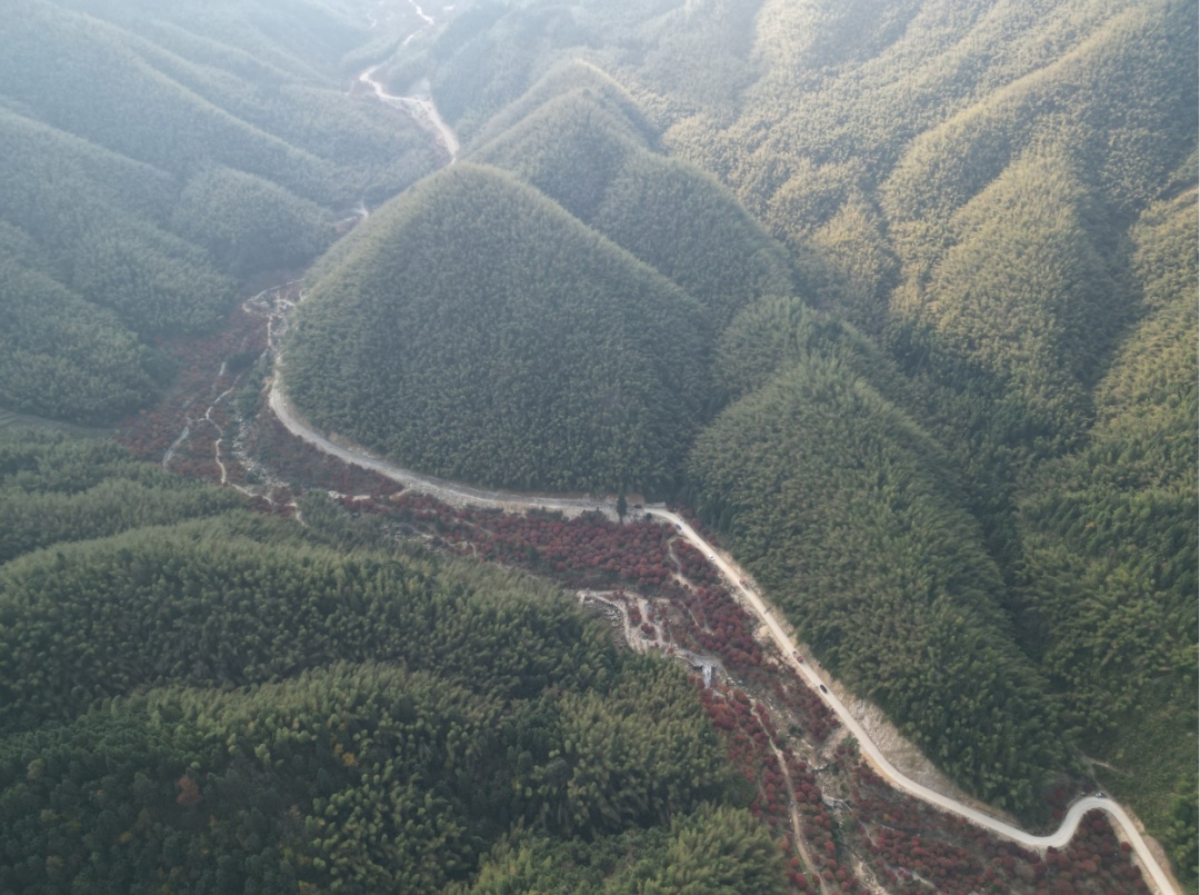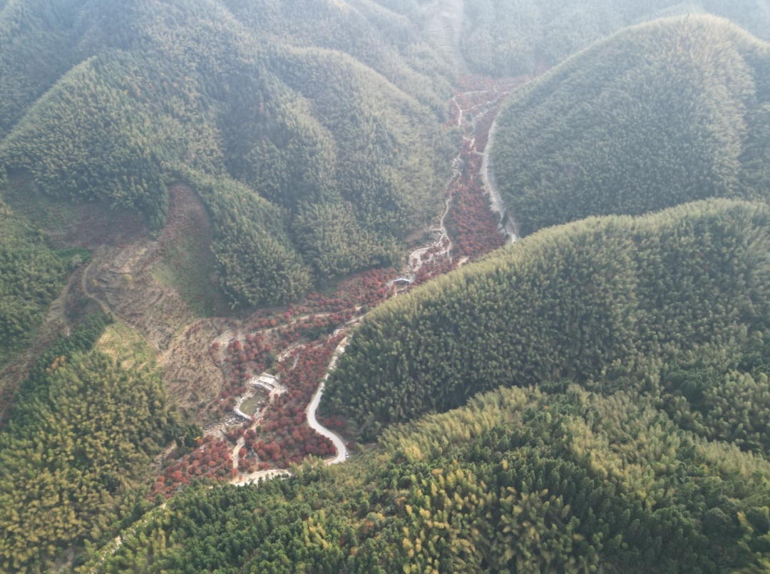 从高空俯瞰,火红的枫叶与竹林山色构成了一幅秋日“枫”景画卷。