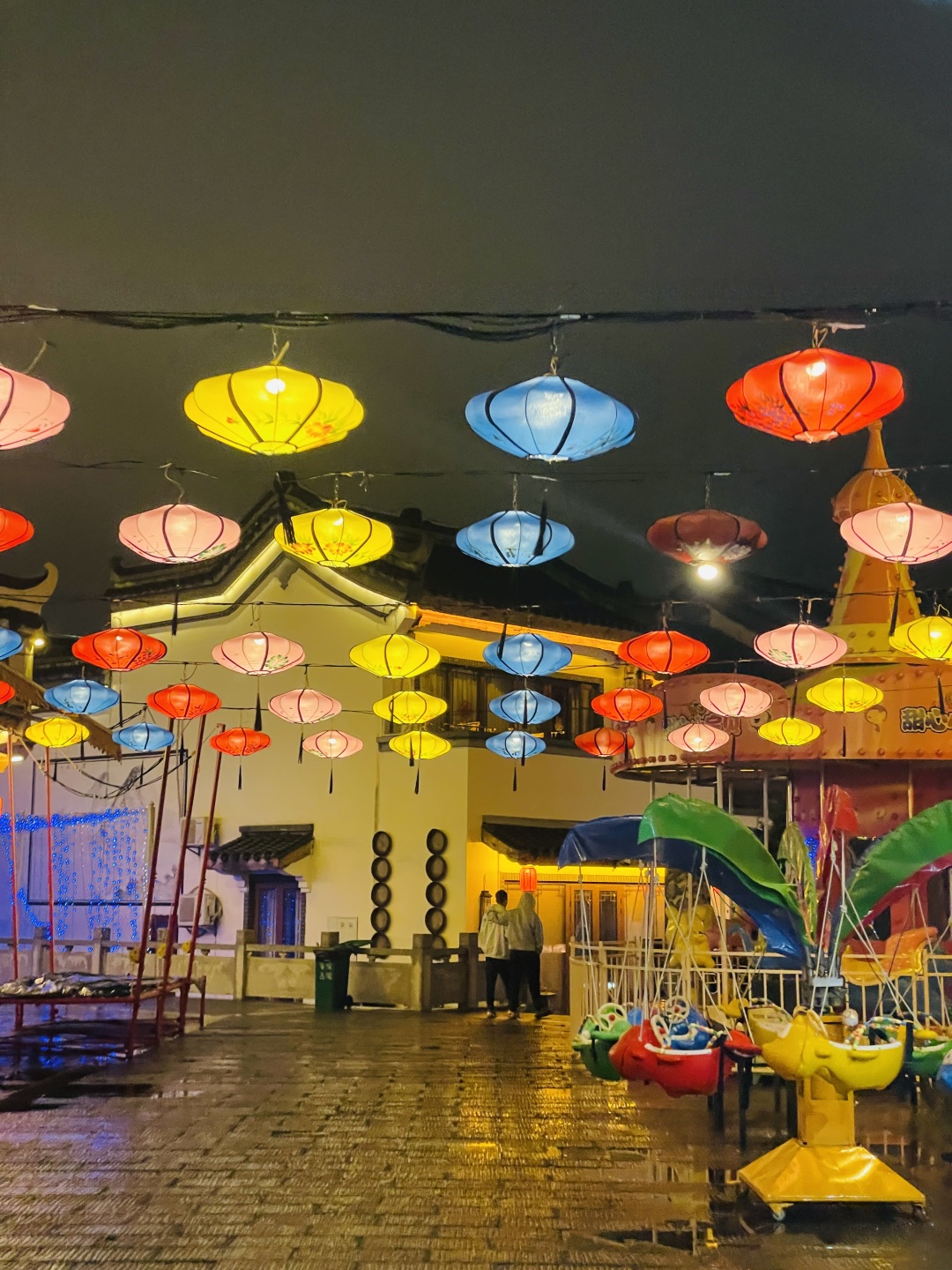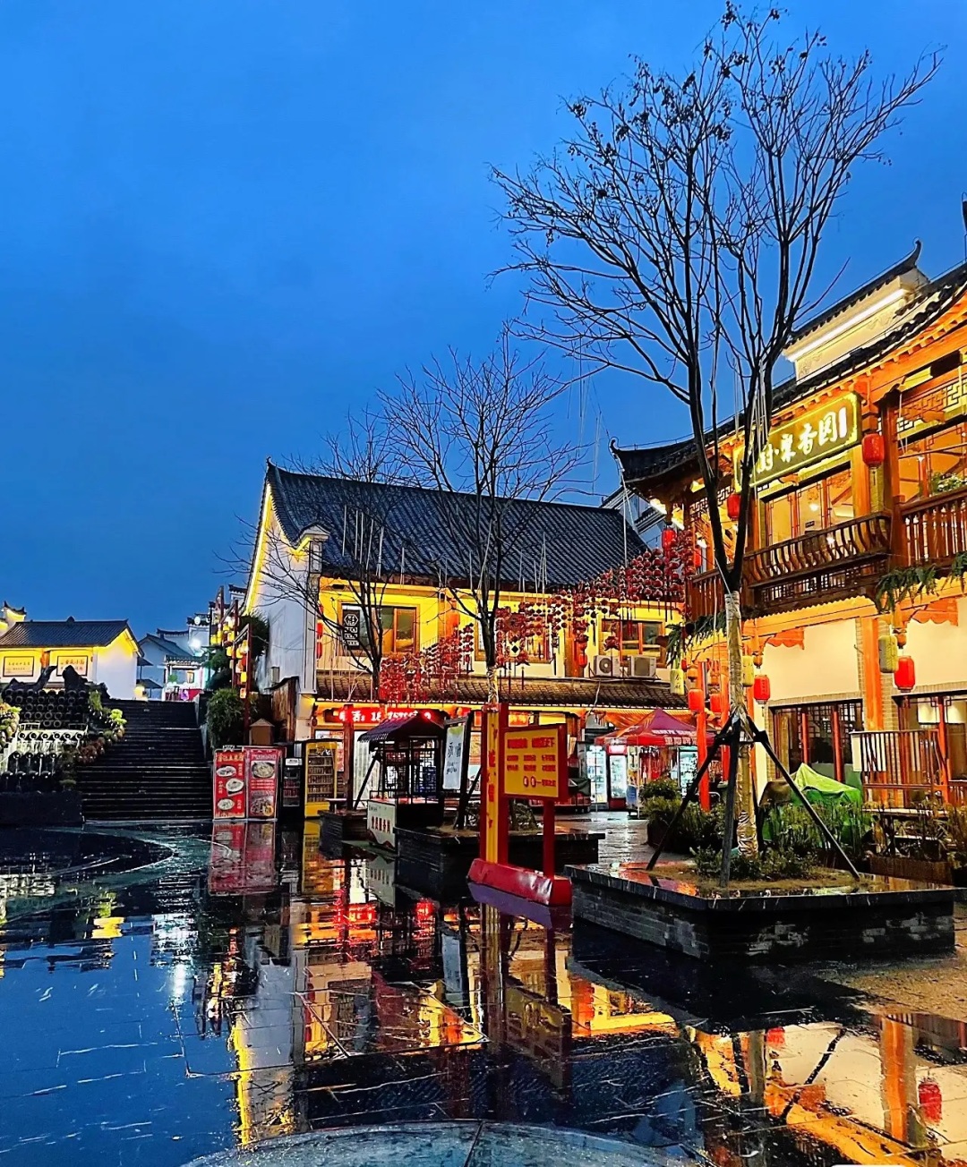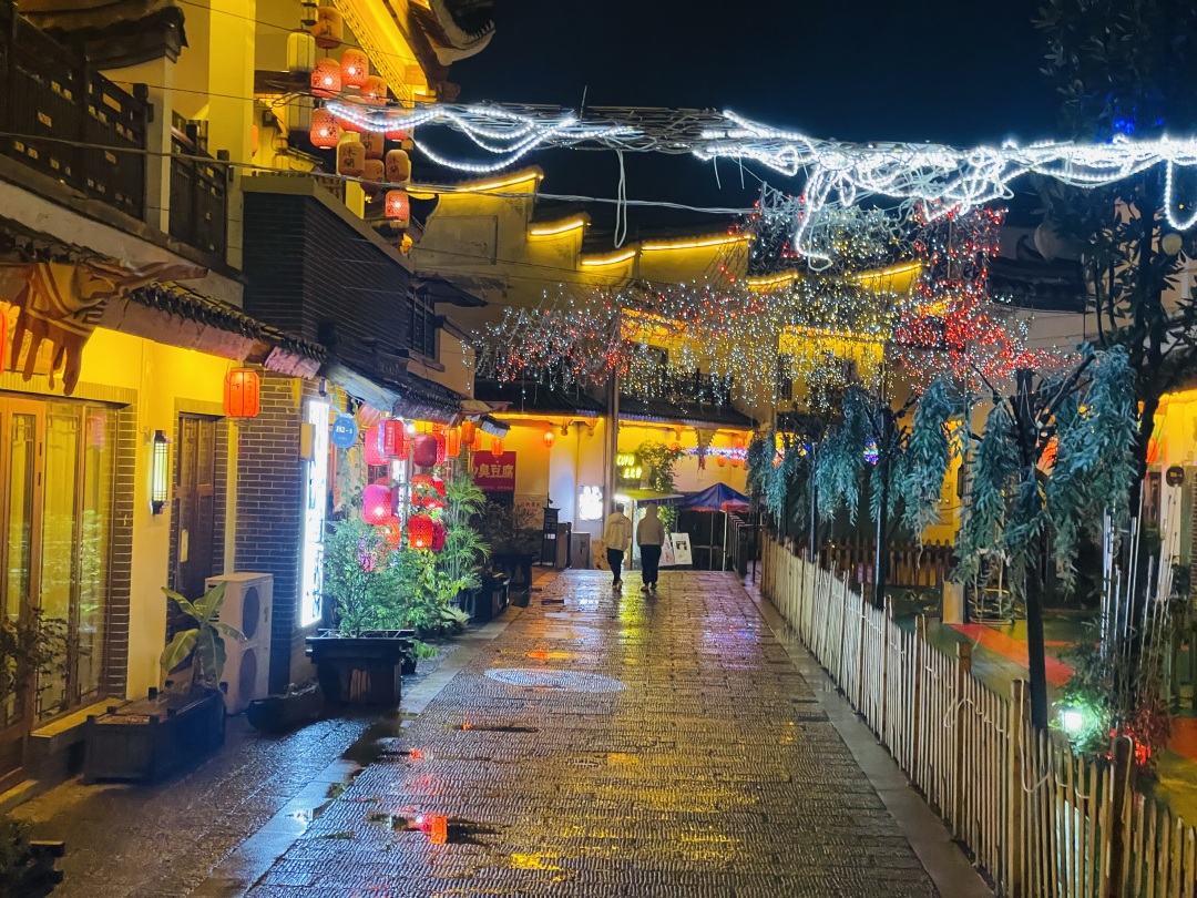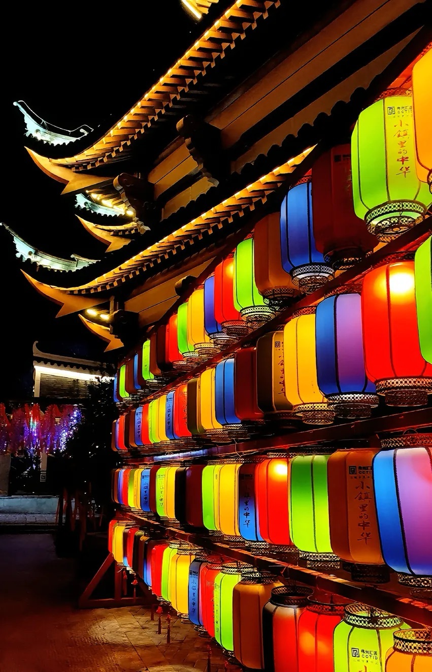 华灯初上,灯笼高挂,布幌摇曳,屋黛瓦青的街巷热闹非凡。
