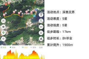 全程共19公里(2公里马路+17公里山路),起伏连绵大小山头共计108个,累计爬升1900米,约等于两倍大小梧桐山难度,要求有能轻松爬完大小梧桐山的体力才可去挑战