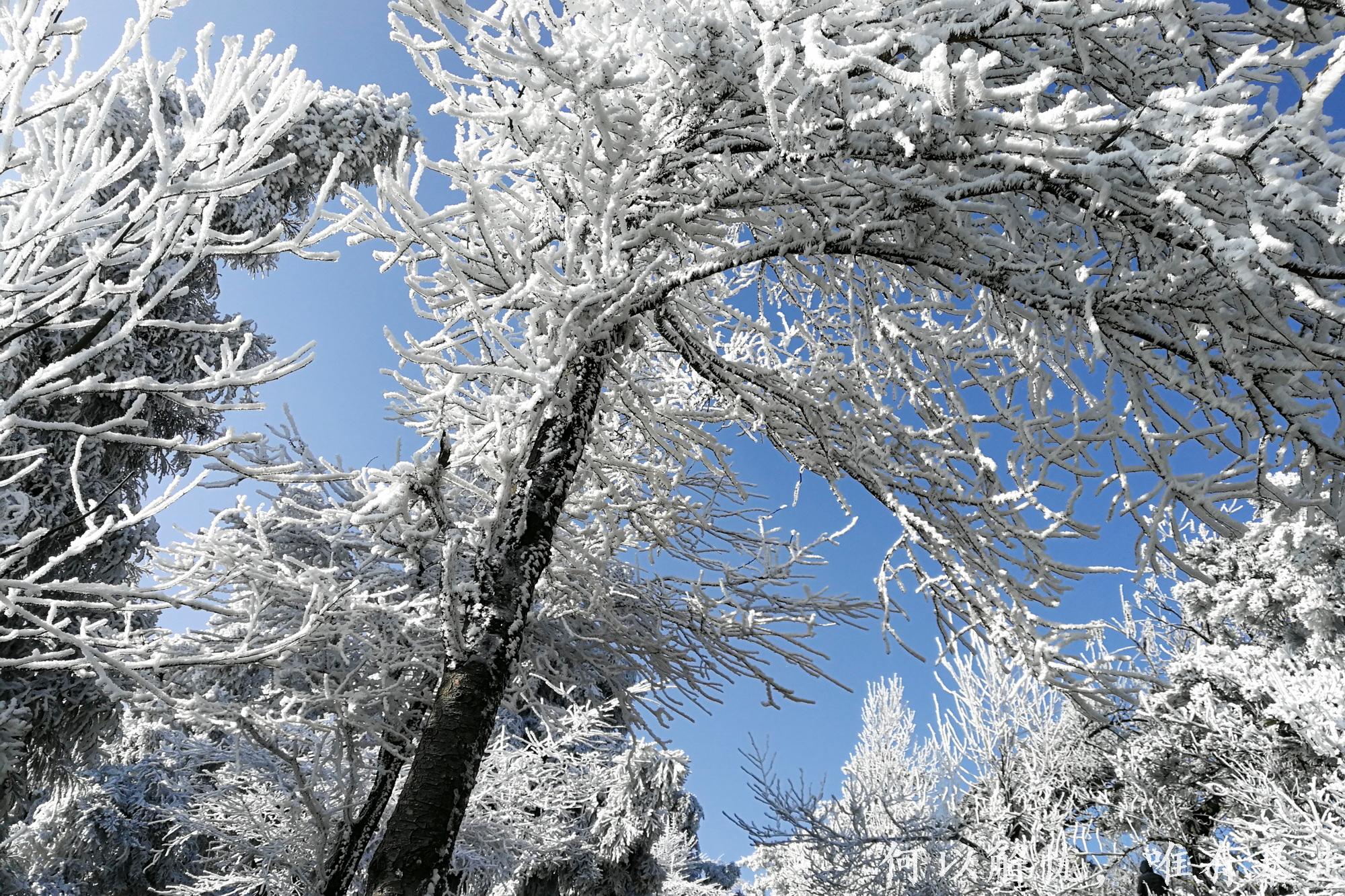 雾凇是低温时空气中水汽直接凝华的自然现象,它就像技艺高超的化妆师,将原本有点残败的生态景观点缀得诗情画意。山色远近苍茫,积雪、飘雪、雾凇互相辉映,一路游览,处处惊喜,用“如此风光画不如”来形容眼前看到的景色再恰当不过。