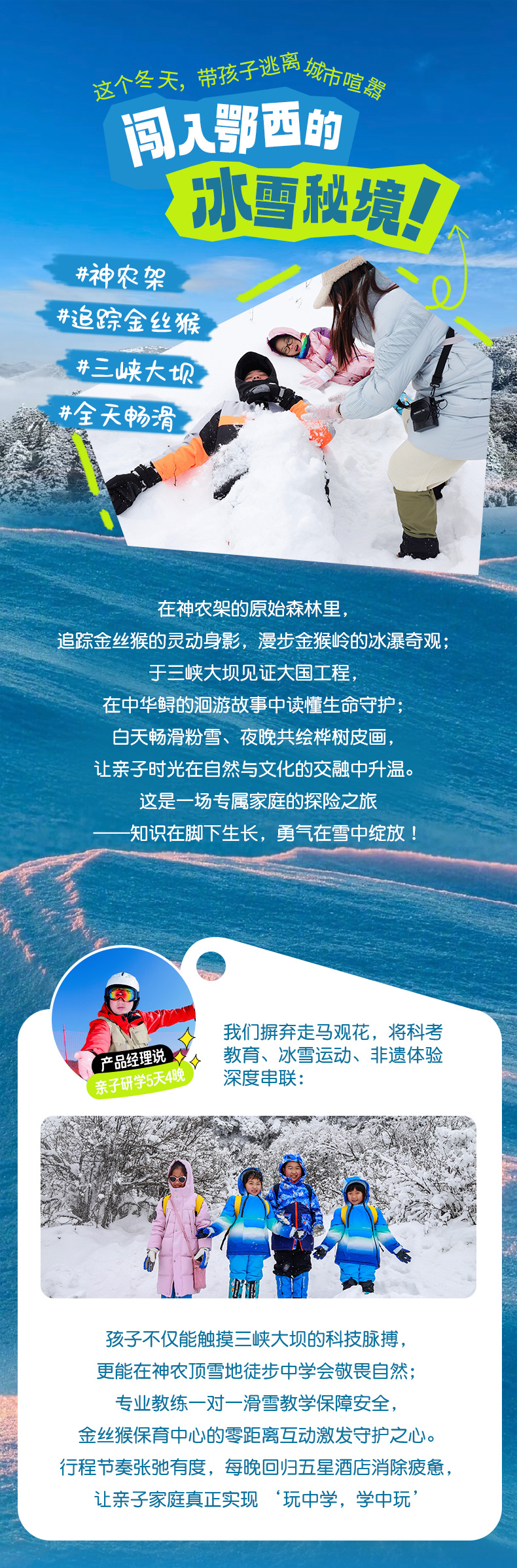 下午:我们将会前往金猴岭,在这里可以看到美丽的蓝冰冰瀑,接下来,我们前往神农顶,在雪地嬉戏,前往丛林,寻找动物脚印;