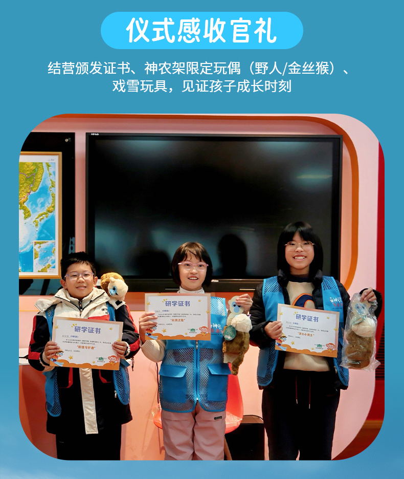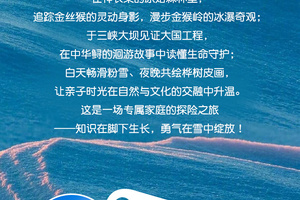 上午:龙潭金丝猴科研基地是仅有的一处野生金丝猴研究基地,在老师的带领下近距离观察金丝猴。我们的领队老师会为大家讲解金丝猴的习性以及特征等。最最重要的是,大龙潭的金丝猴特别温和,小朋友们可以近距离观看金丝猴在枝头跳跃或雪地寻找食物,在这里可以充分感受到人与自然的和谐。