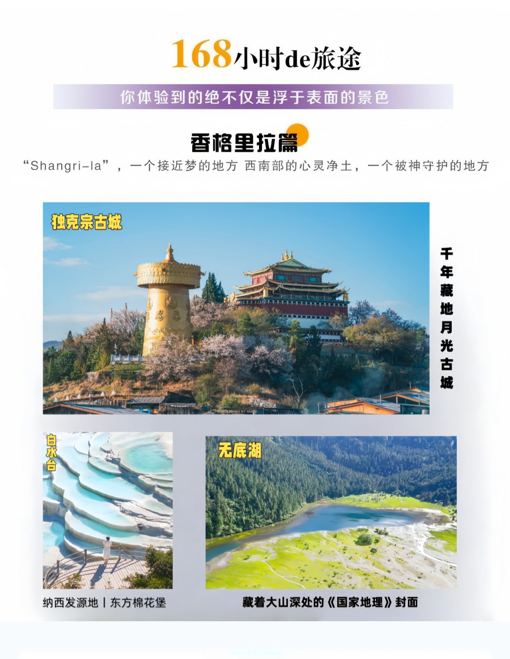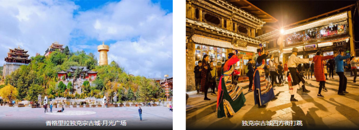 独克宗古城:也称“月光城”是中国保存得好的藏民居群,具有1300多年历史,是茶马古道上的重镇是马帮进藏后的首站,是滇藏茶马古道的重要枢纽。古城大龟山上有吉尼斯记录的大型转经筒,用你的双手去转动经筒,为你的家人和朋友、爱人祈福。