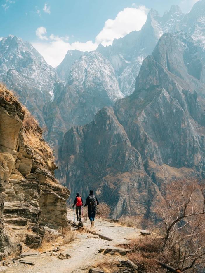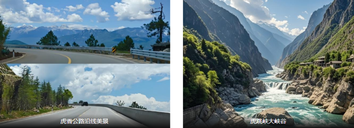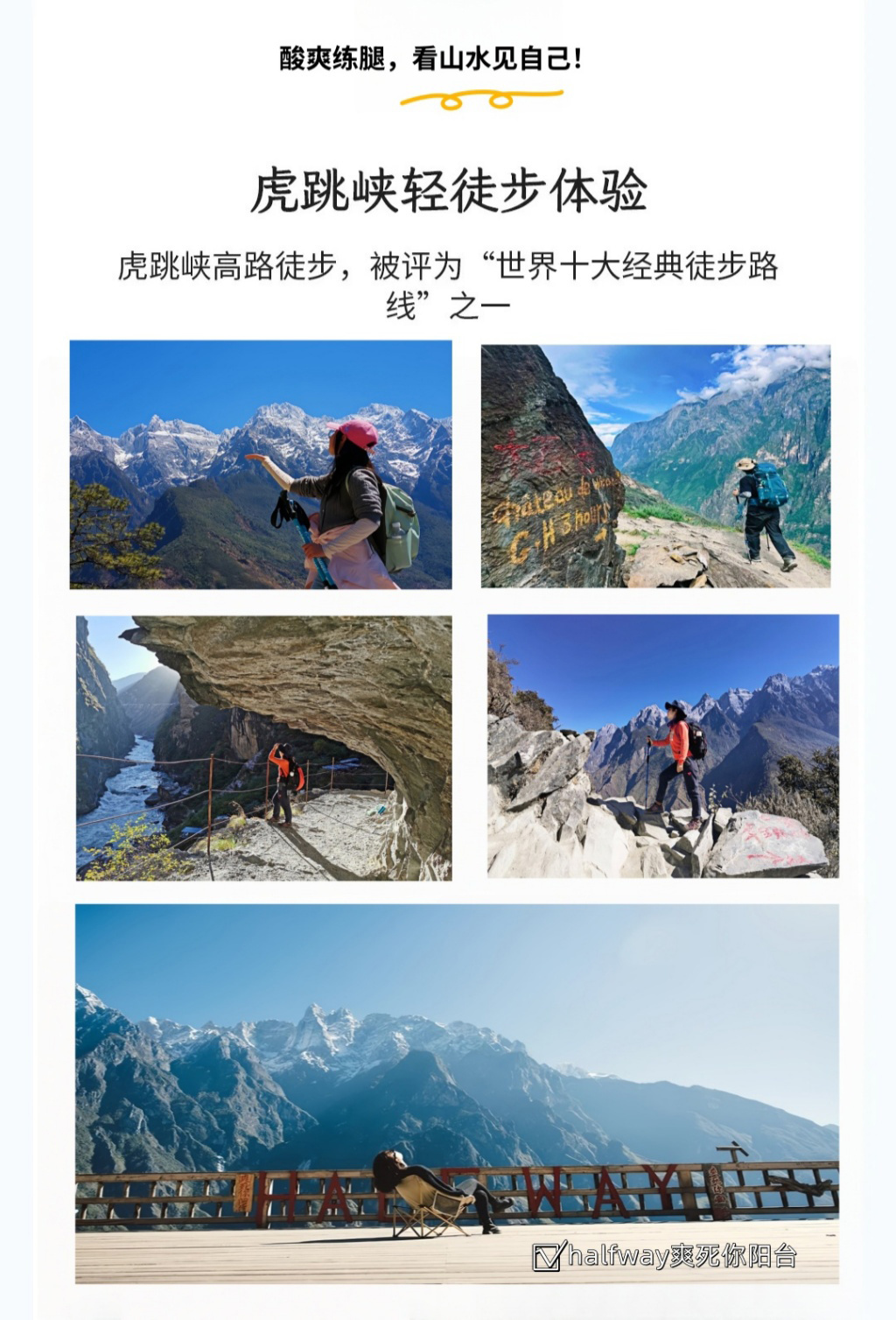 虎跳峡大峡谷:横穿与哈巴和玉龙雪山之间因猛虎跃江心石过江的传说而得名,以“险”而名天下,沿着虎跳峡高线开启探索虎跳峡之旅。这里是世界十大经典徒步线路的精华段,以险奇秀著称。在虎跳峡的悬崖道上感受惊心动魄的落差和绝美的岩壁。
