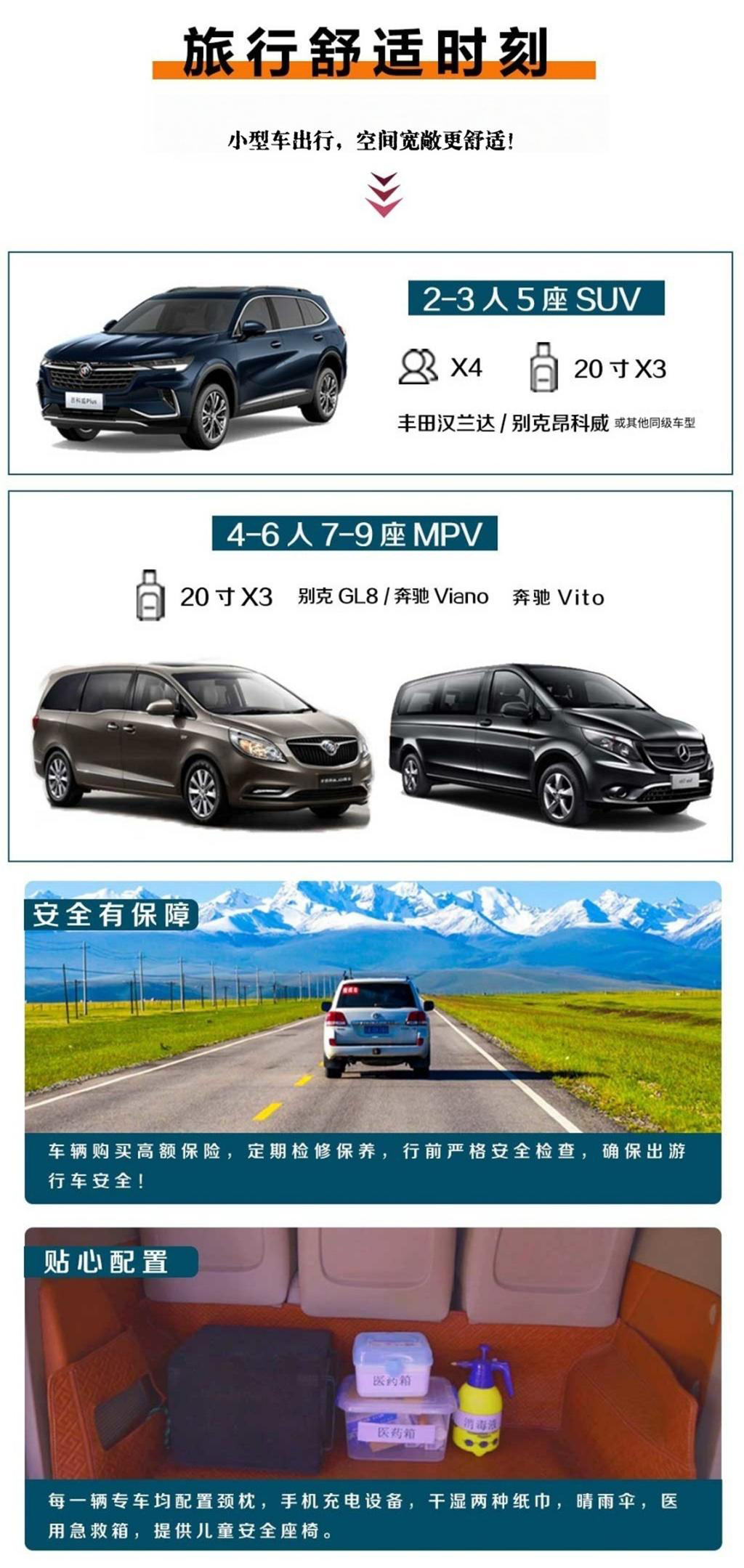 车辆:当地旅游用车(1人1座,根据成团人数安排用车:2-4人安排5座SUV,5-6人安排7座商务车,7-8人安排9座商务车)