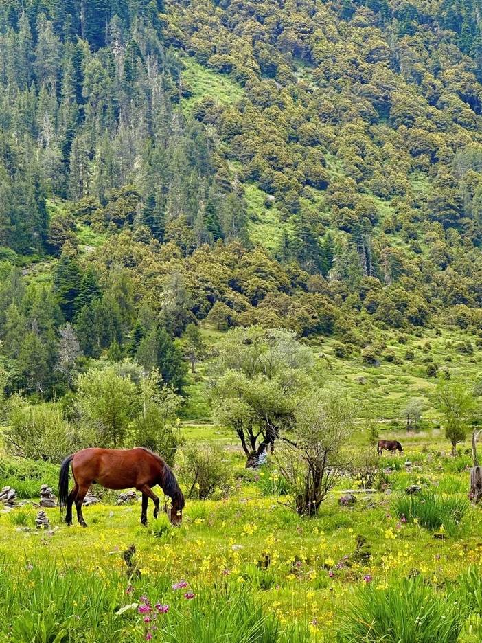 午餐后乘车穿越格咱乡道沿途欣赏无名雪山,随后经各卡乡道沿途欣赏浪都大峡谷,沿途的高原牧场以及森林、其风景无限,翻越俄初山后抵达【香格里拉镇】这一路风光无限,秀美的高山峡谷、湿地间牦牛牧场散放在高山草甸间。
