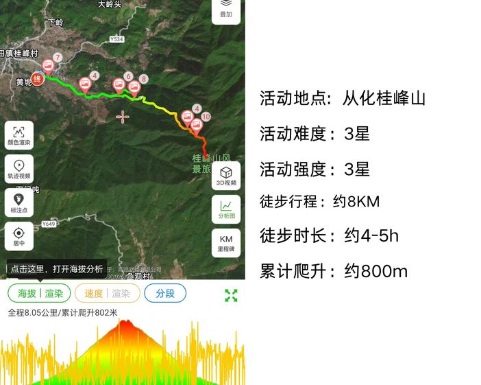 徒步全程约8公里,累计爬升约800米。起点桂峰村,终点桂峰村,一路经过农耕路、机耕路、水泥路、土路野路等乡村道路