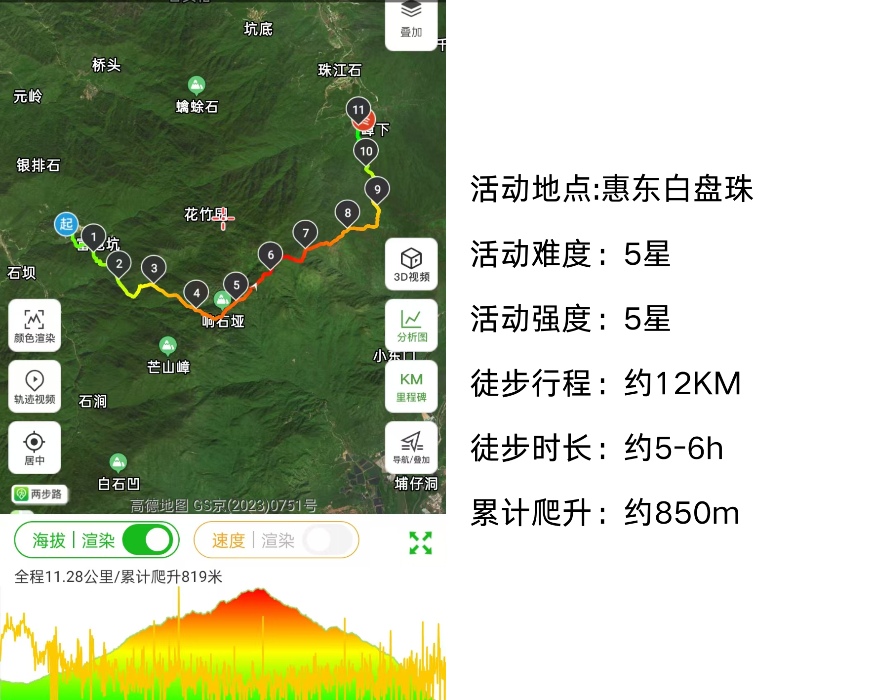 全程约12公里,累计爬升约850米,用时约5-6小时走完,