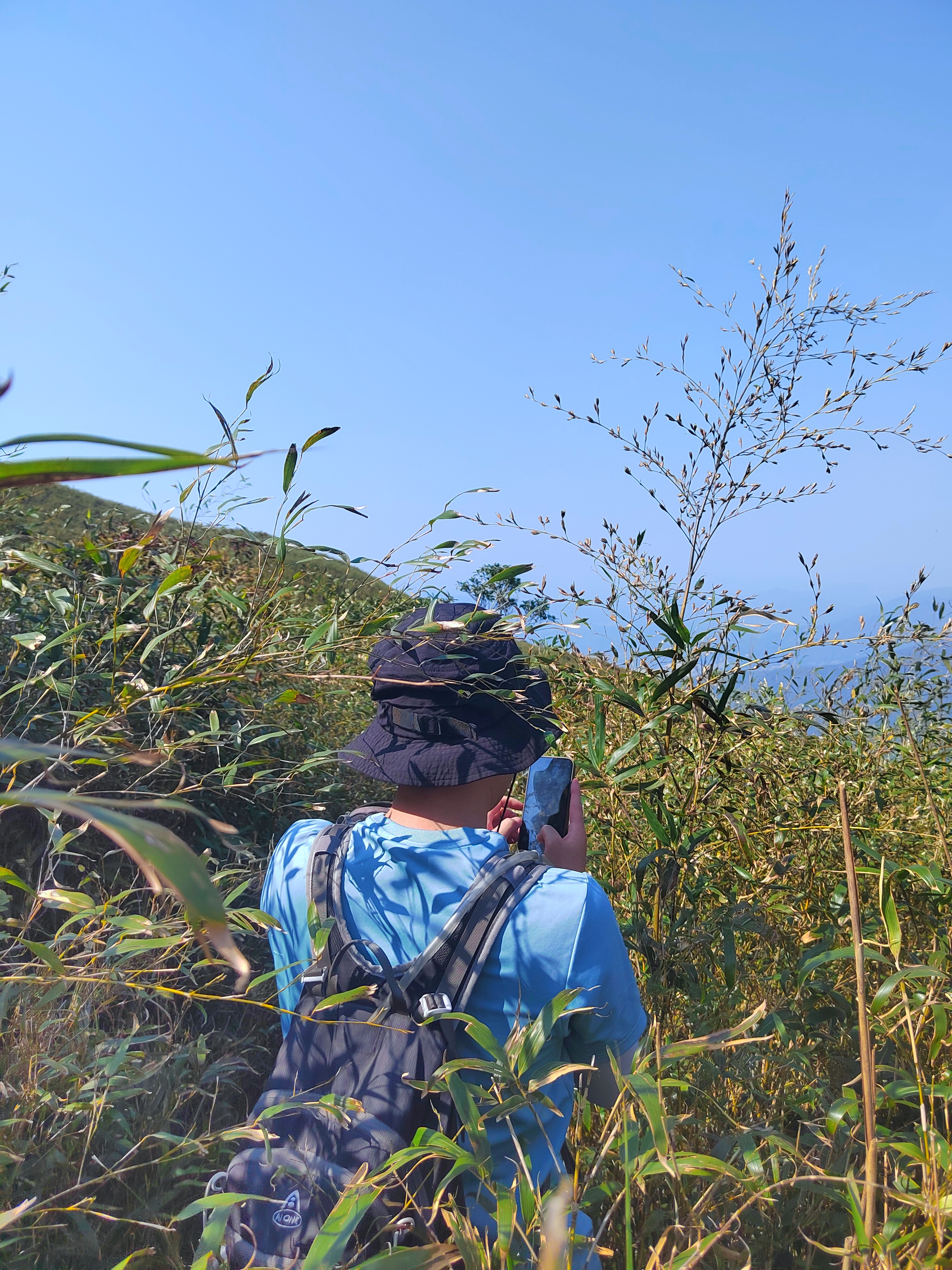14:00到达大卡子栋山顶,打卡拍照后,原路返回到岔路口开始下山