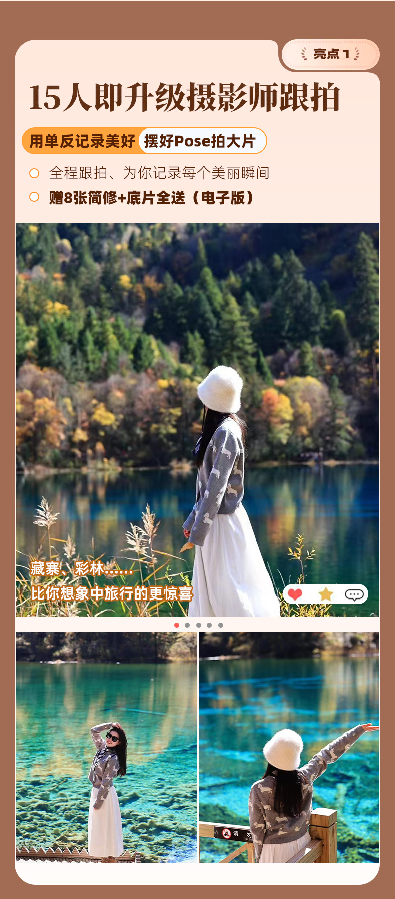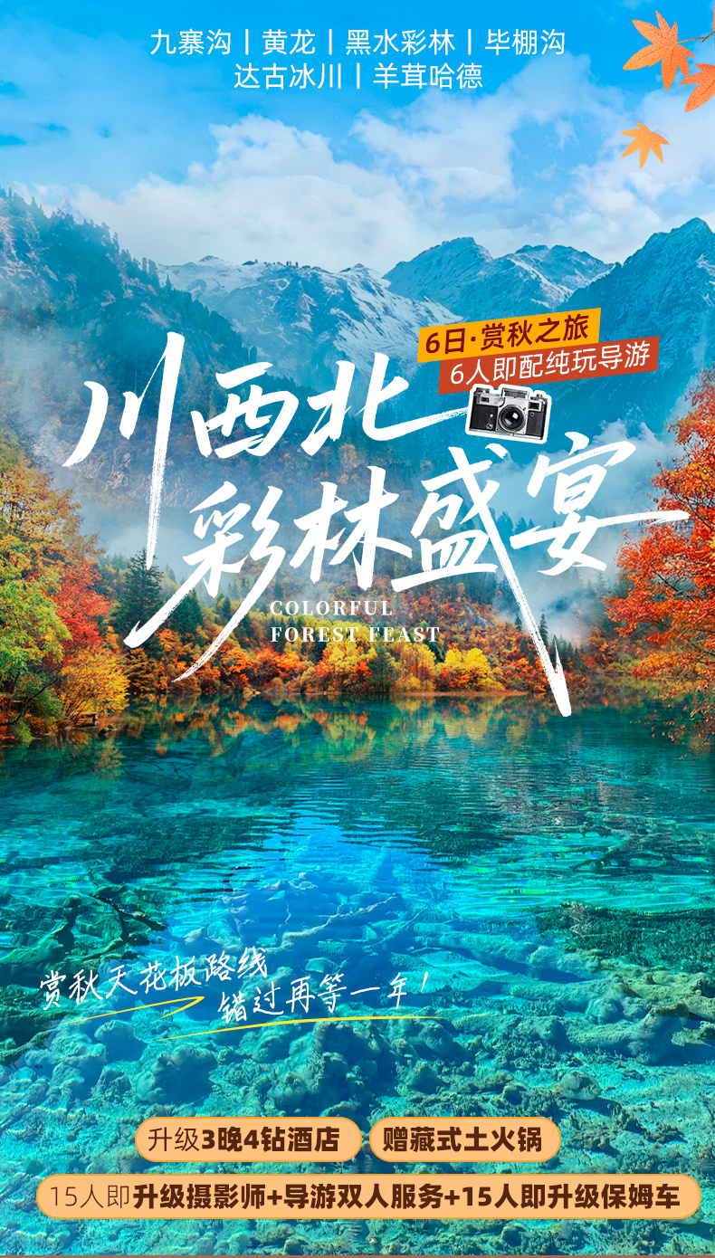 15人即升级摄影师+导游双人服务 · 升级3晚4钻酒店 · 九寨沟+黄龙+黑水彩林+毕棚沟+达古冰川+羊茸哈德6日深度游