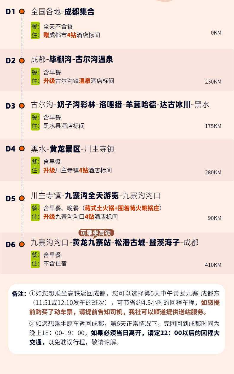 4、景交:黄龙索道上行80元/人+下行40元/人(建议乘坐)、黄龙观光车20元/人(可选),九寨沟观光车90元/人(必须),达古冰川观光车70元/人(必须)、往返索道180元/人(可选),毕棚沟观光车70元/人(必须)、电瓶车20-30元/人(分段计费、可选);