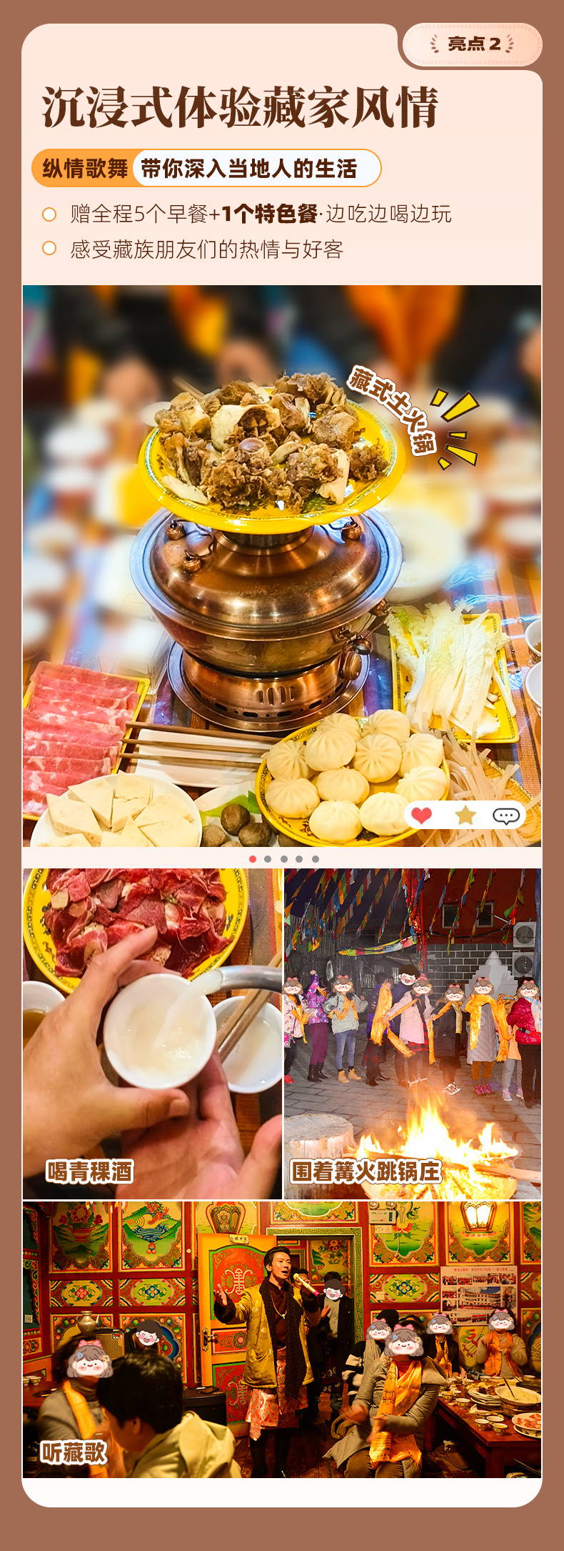 1、藏式人文体验:藏家主人献哈达、喝酥油茶、围着篝火跳锅庄;