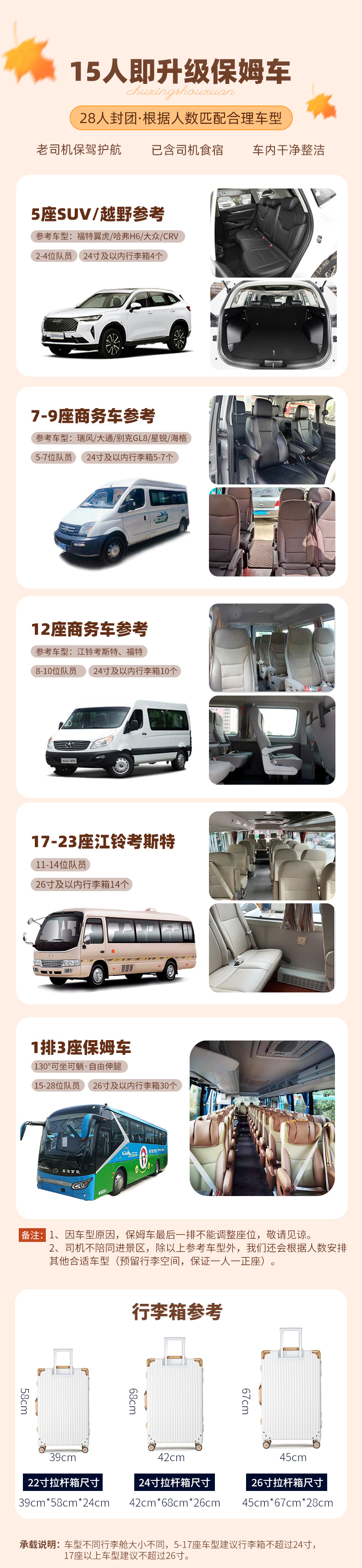1、交通:根据人数确定车辆,15人即升级保姆车(已含驾驶员食宿);