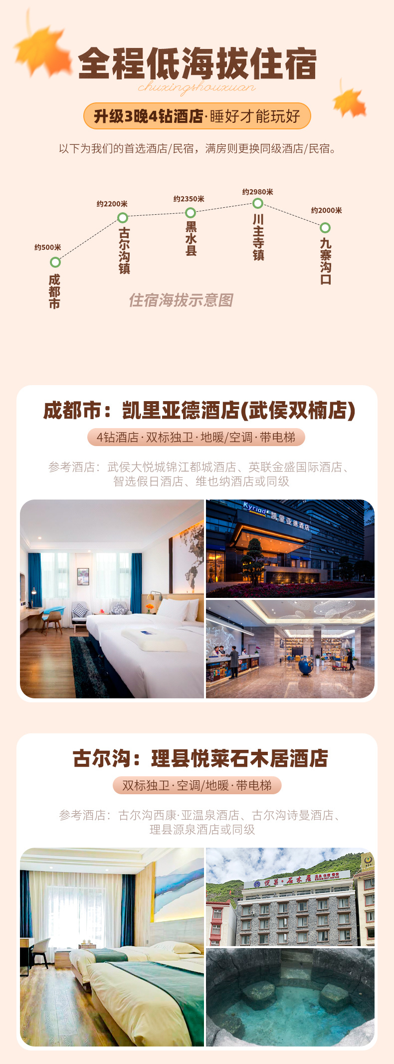 2、住宿:全程5晚住宿(升级3晚4钻酒店,含集合日1晚赠送酒店、不住不退);