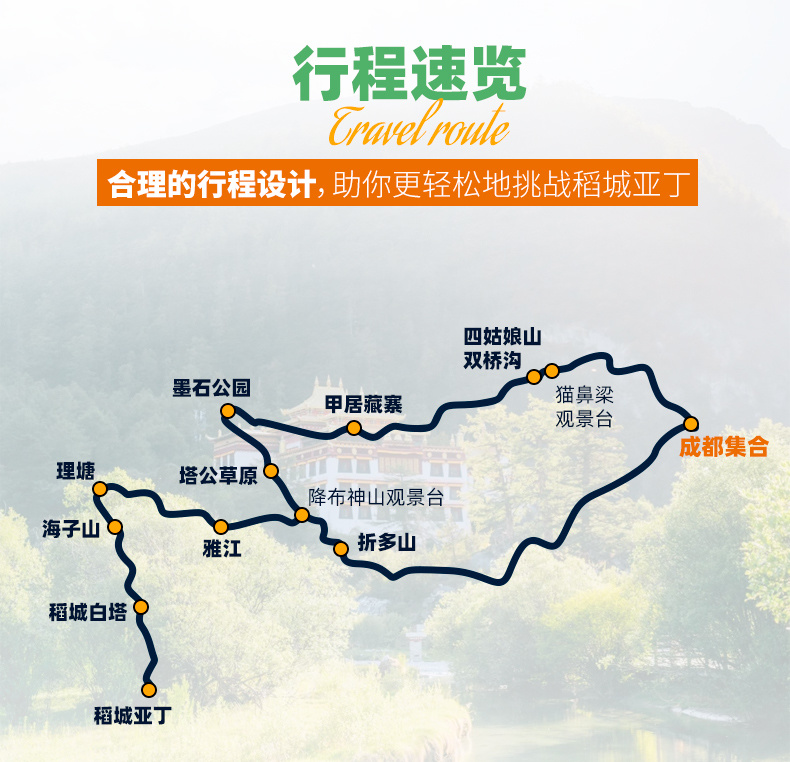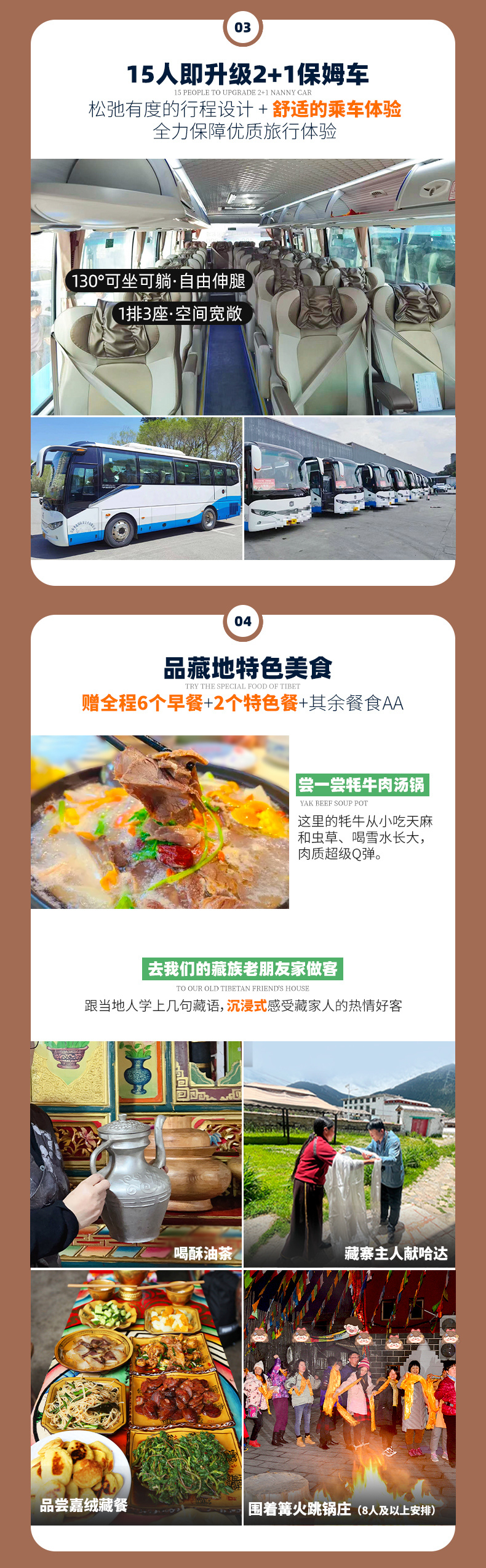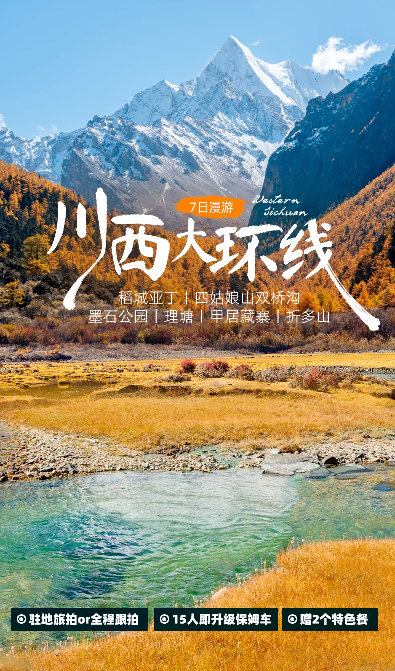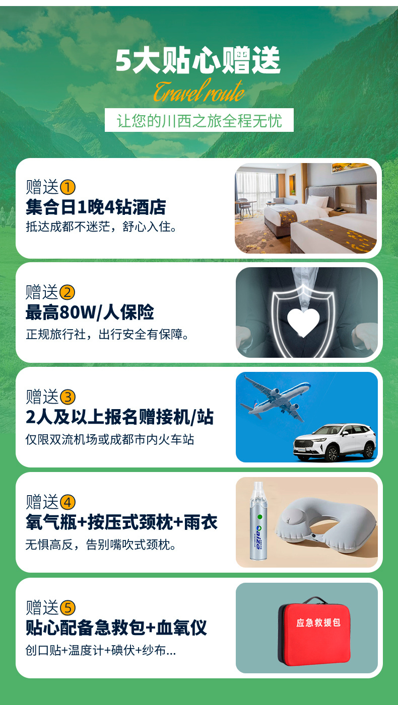 4、景交:四姑娘山观光车70元/人(必须),甲居藏寨观光车35元/人(必须),墨石公园观光车20元/人(必须),稻城亚丁观光车120元/人(必须)、稻城亚丁游览车70元/往返(可选);