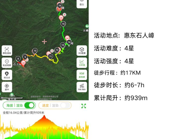 全程约16公里(土路,阶梯)最高海拔1096米,累计爬升约939米。能原路返回,没有缆车,观光车等