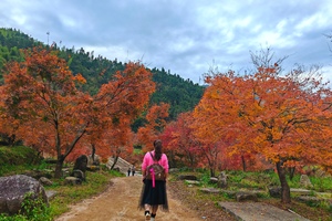 14:00 左右到达【十万株枫叶林】,跟随领队一起去赏枫,抬眼望去,层层叠叠的枫叶红得浓烈,红得似火,染红了山谷,染红了山涧,就像一条鲜红的地毯铺在蜿蜒曲折的山谷中,美轮美奂,美不胜收(当地有少量农庄,最好带上干粮)。
