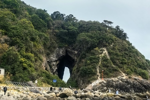 穿鼻岩属于海蚀拱桥地貌,是海岬两侧因长期海蚀作用形成海蚀洞,