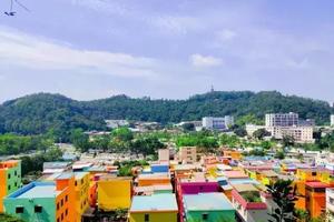 亮点2:江门市江海区彩色艺术村落,五彩斑斓彩虹村:红、橙、黄、绿、青、蓝、紫各色混搭,横坑里被粉刷得像是一个小型的童话王国,成为江门新晋的网红打卡点。