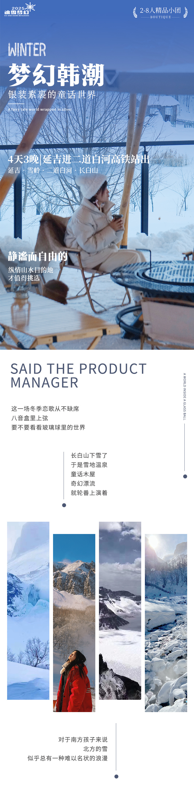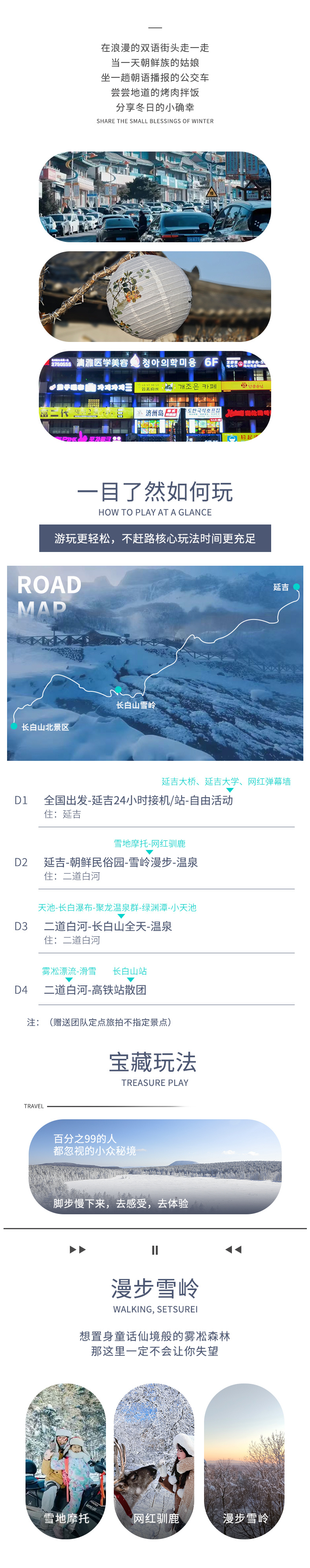 延吉-朝鲜民俗园-雪岭漫步(117KM,车程约2.5小时)-雪地摩托-网红驯鹿-二道白河(62KM,车程约1.5小时)