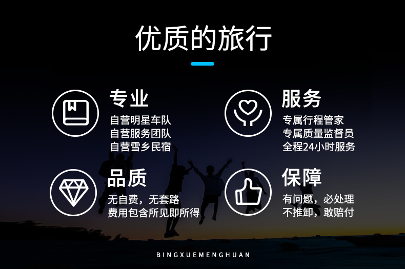 4、 11月下旬之前,如遇气候原因雪量不够,无法运行雪地摩托,需要徒步进入景区观看驯鹿,或者取消雪岭行程,费用现退。