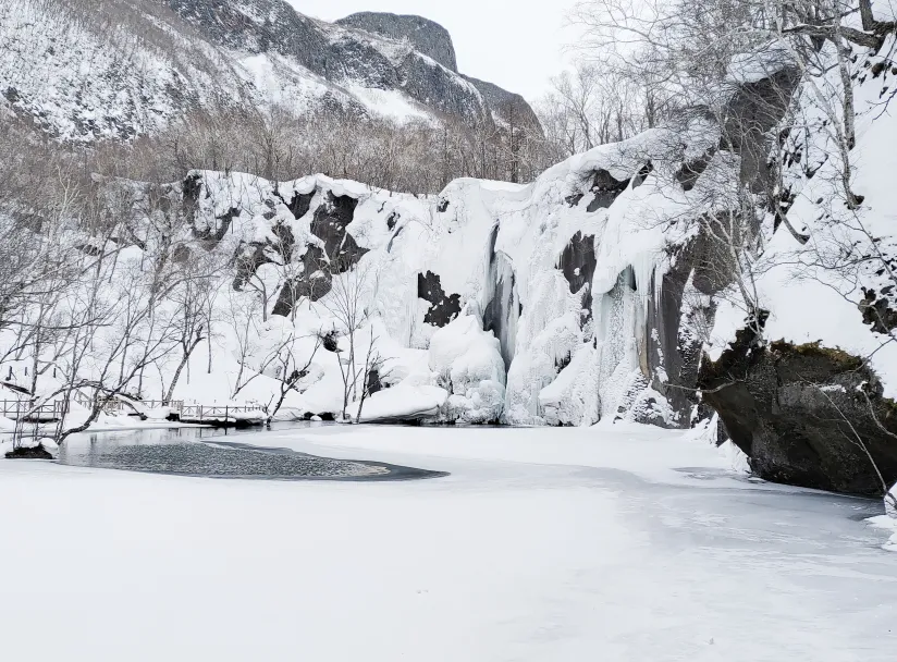 11:00 乘倒站车返回到中转服务站,换乘环保车赴【长白瀑布】,车程约10分钟,步行约20分钟到达长白冰雪瀑布底部近距离观看、摄影,参观【聚龙温泉群】,周围一片白雪,中间却热气腾腾,甚是美丽,游览30分钟,步行20分钟返回瀑布停车场。