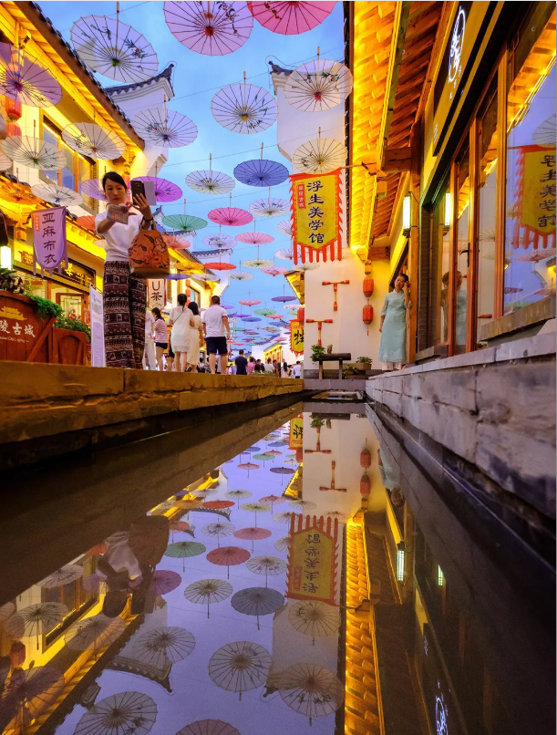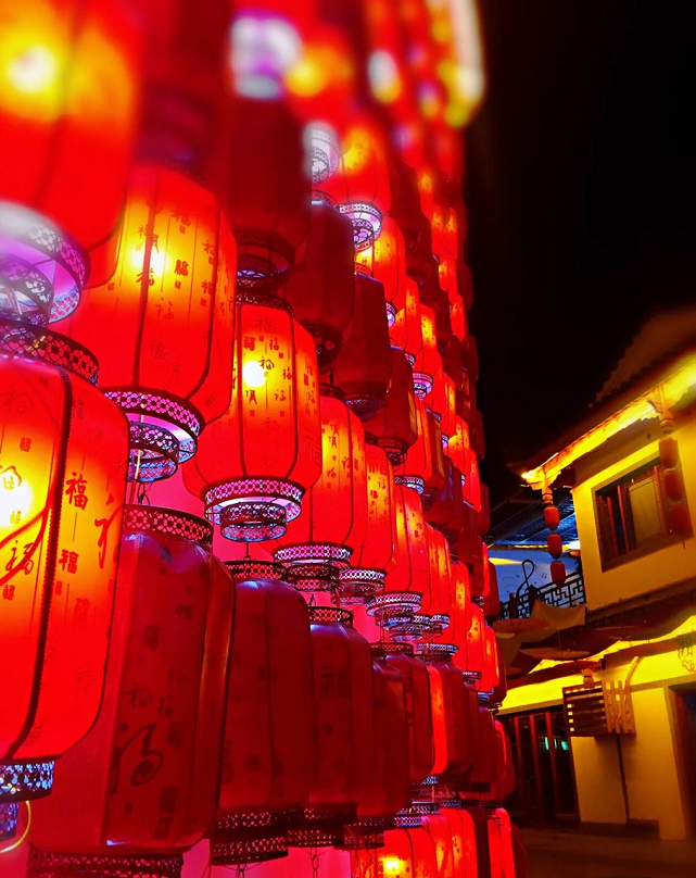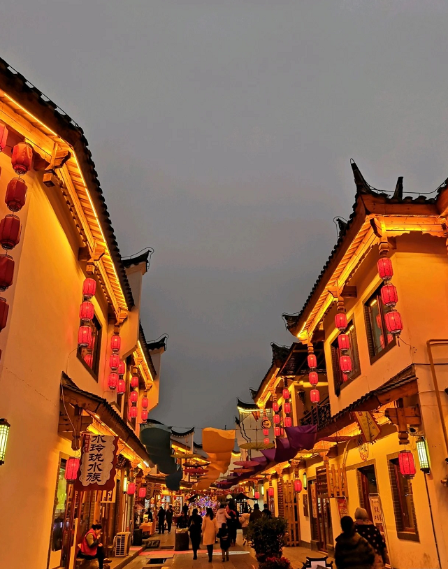 华灯初上,灯笼高挂,布幌摇曳,屋黛瓦青的街巷热闹非凡。