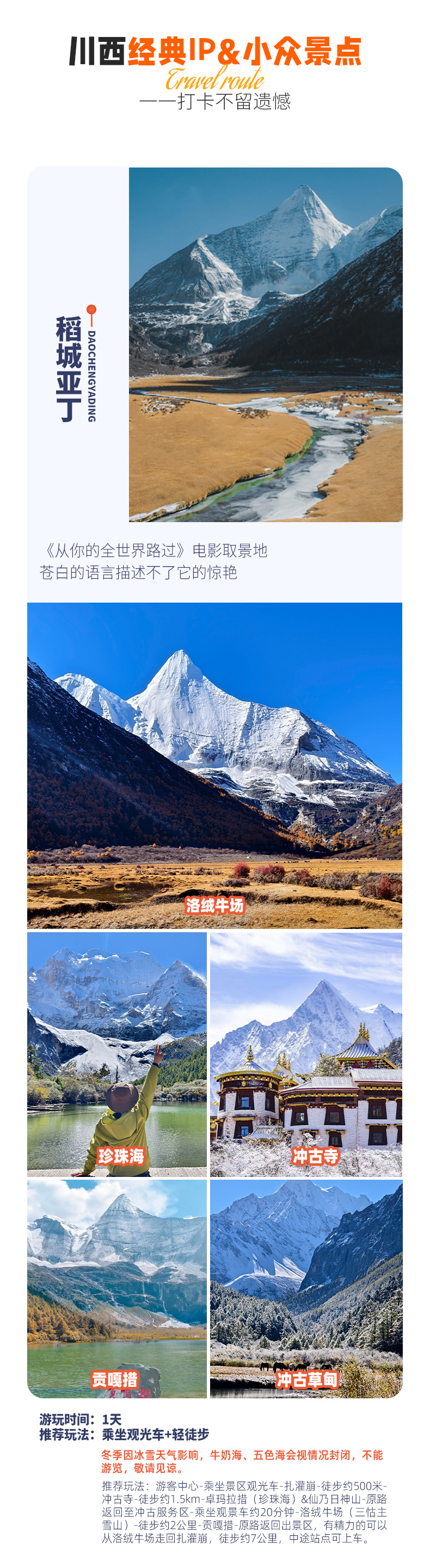 4、景交:稻城亚丁观光车120元/人(必须)、稻城亚丁观景车70元/往返(可选),墨石公园观光车20元/人(必须),四姑娘山双桥沟观光车70元/人(必须),红海子清洁费30元/人(可选),鱼子西清洁费30元/人(必须);
