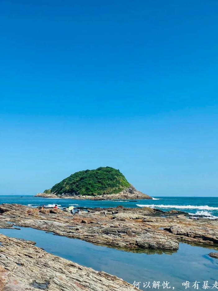 狮子岛,很多人听起来以为是一个海岛,其实狮子岛就是一块巨大的礁石,占地面积也不过几百平方,潮汐退却的时候可以从沙滩走过去,名字的由来也是因为它的外形看上去就像一头俯卧在海边的雄狮。不过为什么说它是头雄狮而不是母狮?因为整个狮身的礁石寸草不生,唯独狮头处郁郁苍苍地长着一些植被,像极了雄狮的鬓毛,也让这头狮子看上去更为传神。