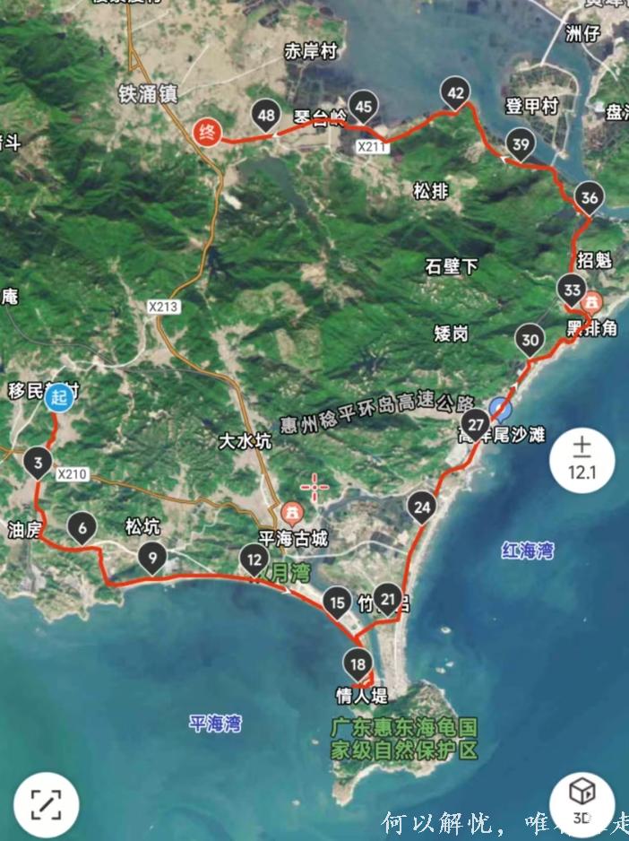 骑行全程50公里,路线主要分为三部分:狮子岛海岸线沙滩,黑排角土路越野,部分乡村道路