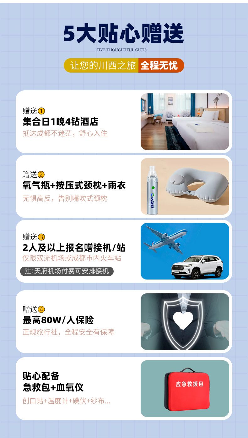 7、2人及以上报名赠双流机场接机/成都市内火车站接站(天府机场接机需自理费用)。