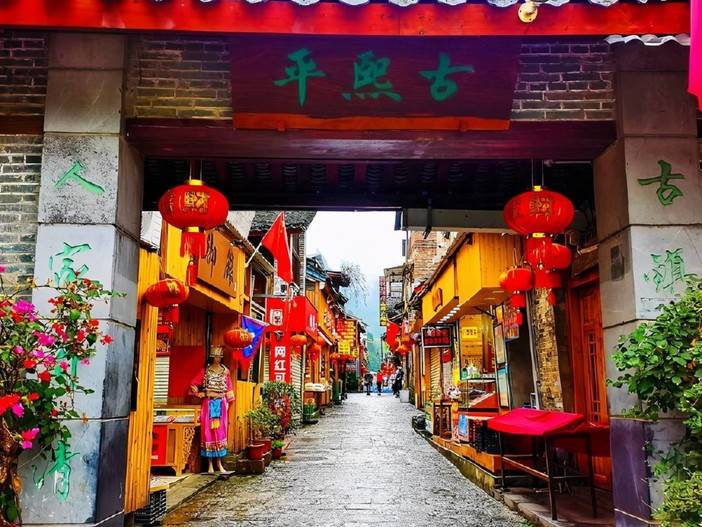 兴坪古镇是一条长1公里多的石板街从兴坪古镇东南至漓江榕树潭、古渡码头,便于居民、客商来往,各省的会馆建筑于古街的两旁,各类砖瓦结构的古建筑大部分保存完好。