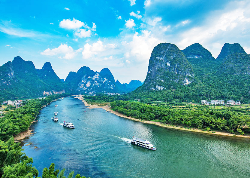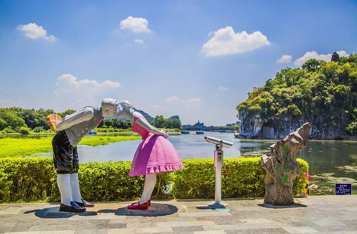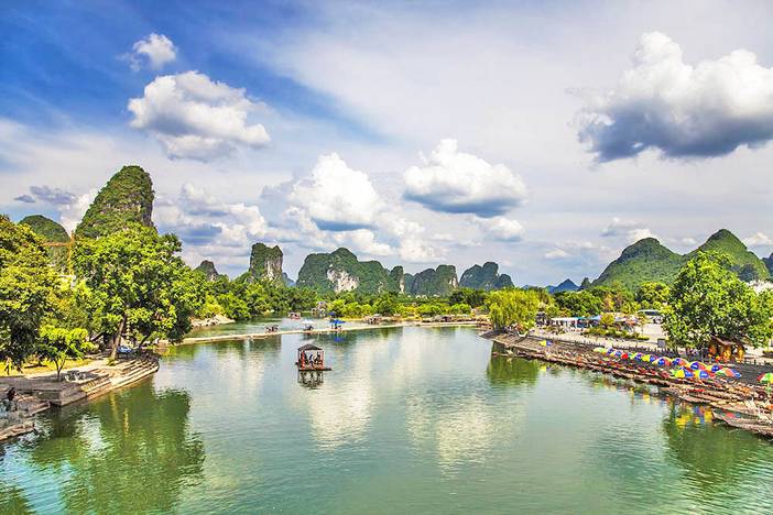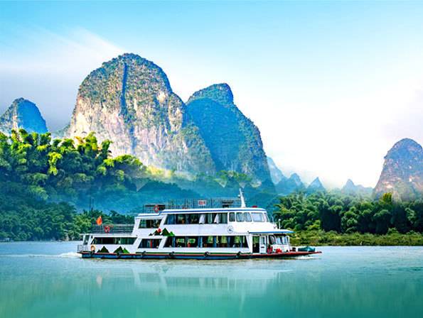 乘船游览沿途观赏美丽的田园风光欣赏漓江的精华段【兴坪漓江】,四周奇山异景,风景秀丽,江水清澈,东有朝笏、罗汉、僧尼、狮子诸山;北有寿星、骆驼山;西有笔架、美女山;西南有螺蛳、鲤鱼山,在这里您可以欣赏黄布倒影(20元人民币的背景),并合影留念。