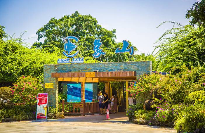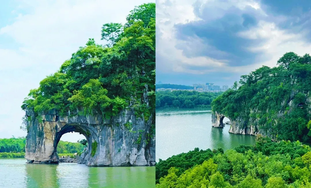 桂林市山水代表、城市象征——城徽,其山酷似一头驻足漓江边临流饮水的大象,栩栩如生,引人入胜,山体前部的水月洞,弯如满月,穿透山体,清碧的江水从洞中穿鼻而过,洞影倒映江面,构成“水底有明月,水上明月浮”的奇观。