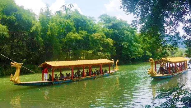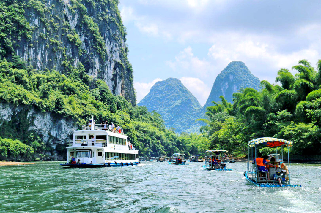 早餐后,前往体验【遇龙河多人竹筏漂流】(游览时间约50分钟),遇龙河是围绕在阳朔县西南部一条美丽的河流,“不是漓江、胜似漓江”,被央视赞誉为阳朔最美风景,田畴平整开阔,绿意逼人,微风吹过稻浪翻,白云走处碧波滚,景色宜人。在这里您可以真正感受到“小小竹排江中游、巍巍青山两岸走”的绝妙意境。车观如诗如画【十里画廊】,深度感知阳朔醉美山水田园风光,与风对话,与山为邻,畅游在美景之中;以更舒适的方感知阳朔,秀丽的景色像一幅幅画映入眼帘。前往游览有着“水中水,山中山,桂林山水第一湾”的美誉【荔江湾景区】(游览约2小时,含龙船+划龙舟+天宫岩门票),【乘坐古典龙船】观山、水、人、鱼鹰捕鱼,在青山绿水中寻觅观赏亿万年前自然形成的山体壁画:仙女下凡图、神龙壁画、裸女壁画,壁画自然天成、形象逼真、生动传神、世属罕见。景区内有【国内唯一一家让游客参与的划龙舟比赛】,让您在中国民间盛大的划龙舟比赛中畅游荔江河畔,聆听千年号歌,过足一把英雄瘾。穿越【天宫岩】仿佛到了人间仙境,洞体幅跨距大,平整自然,怪石林立、湖泊密布、瀑水相连、倒影生辉、朝夕变幻、奇妙无穷,堪称世界溶洞一绝。穿过天宫岩,从山下搭乘【索道缆车】(不含缆车费用100元/人,可自愿选择乘坐)一路穿云而过,直达凤凰观景平台体验过山车一般的感觉!后乘车前往桂林(车程约2小时)。晚上可自由前往慢步游古典式园林【榕、杉湖新景】,桂林的文化新地标【日月双塔外观】,【正阳步行街、中心广场】感受桂林都市气息。(自由活动导游及车不安排陪同)
