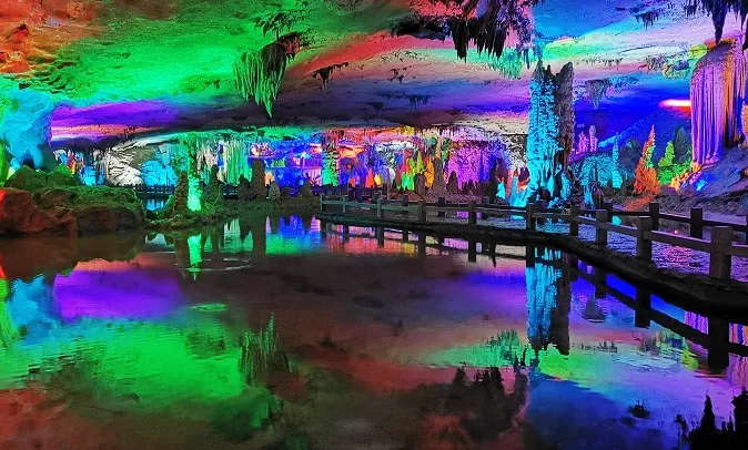 穿越【天宫岩】仿佛到了人间仙境,洞体幅跨距大,平整自然,怪石林立、湖泊密布、瀑水相连、倒影生辉、朝夕变幻、奇妙无穷,堪称世界溶洞一绝。