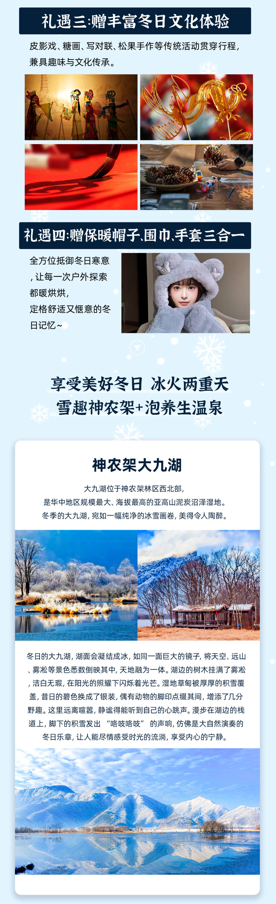 早餐乘车前往坪迁(车程约4.5小时)游览【大九湖景区】(停留时间约2小时30分钟)大九湖国家湿地公园,位于国家级旅游风景区,国家AAAAA级风景区--神农架林区的西北部,海拔1730多米,是我国为数不多的典型高山湿地地区。乘坐景区交通车行驶于湖泊间,蓝天、白云、湖水与湿地相映成趣。“高山平原”、湖北“呼伦贝尔”、南方的 “童话天堂九寨沟”等美誉由此而来。银装素裹,梦幻唯美,宛如仙境,雪后大九湖犹如水墨画,初晴的神农架一片银装素裹。幸运的话还能看到太阳折射而来的蓝冰,可能会因具体天气导致观赏效果不佳,敬请原谅!)