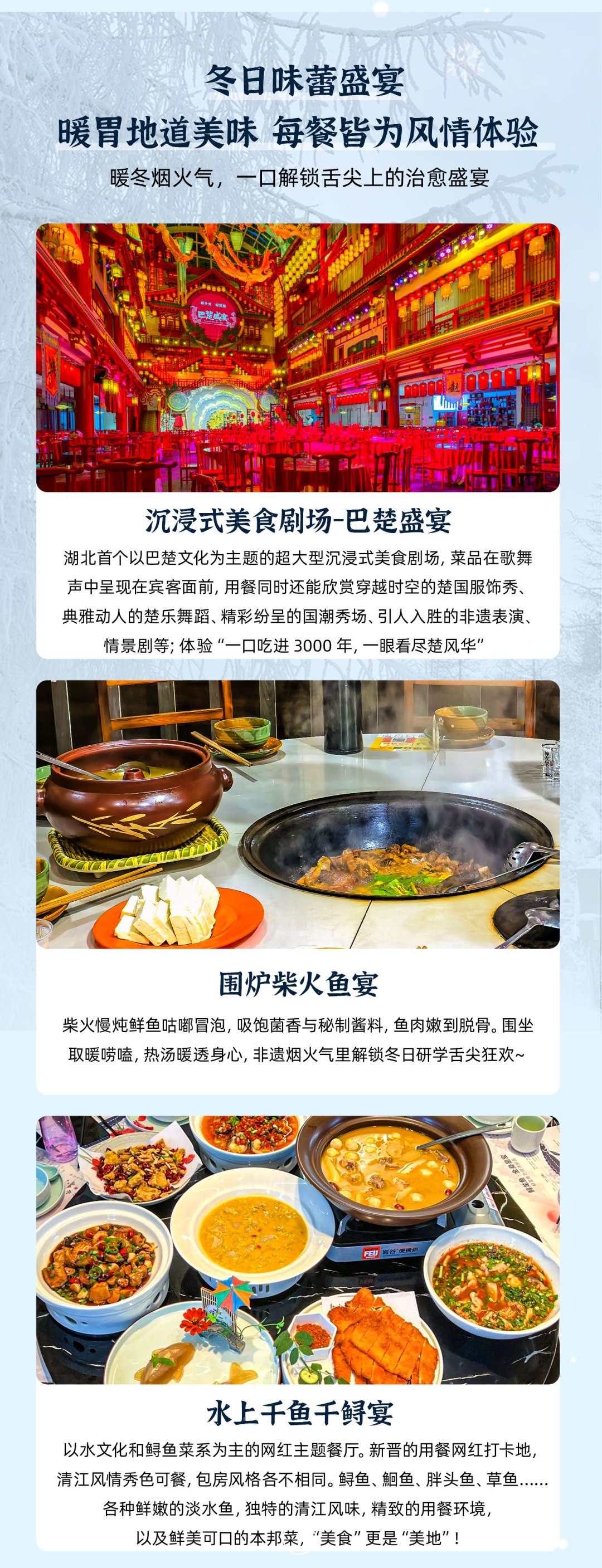 自行前往高铁站,后搭乘高铁前往岳阳,接站后前往游览【荆州古城墙】(车程约2.5小时,外观) 荆州城,又名江陵城,是国务院1982年首批公布的全国24座历史文化名城之一,1996年荆州古城墙又被国务院公布为全国重点文物保护单位。 荆州地处长江中游、江汉干原腹地,是产生与黄河流域中原文化辉映并重,可与古希腊、古罗马文化相媲美的楚文化的发祥地。后前往宜昌(车程约1.5小时)享用特色晚餐【巴楚盛宴】盛宴是以 “巴楚 3000 年” 历史文化为主轴线,是湖北首个以巴楚文化为主题的超大型沉浸式美食剧场,菜品在歌舞声中呈现在宾客面前,从传统小吃到经典大菜,有许多独具巴楚特色的美食,用餐同时还能欣赏穿越时空的楚国服饰秀、典雅动人的楚乐舞蹈、精彩纷呈的国潮秀场、引人入胜的非遗表演、情景剧等;体验“一口吃进 3000 年,一眼看尽楚风华”沉浸式穿越古今乐趣。用餐完毕后入住特别安排的沉浸式楚文化旅居地标【楚乐宫文化主题酒店】将《楚辞》的浪漫哲思,融入每一寸空间设计。
