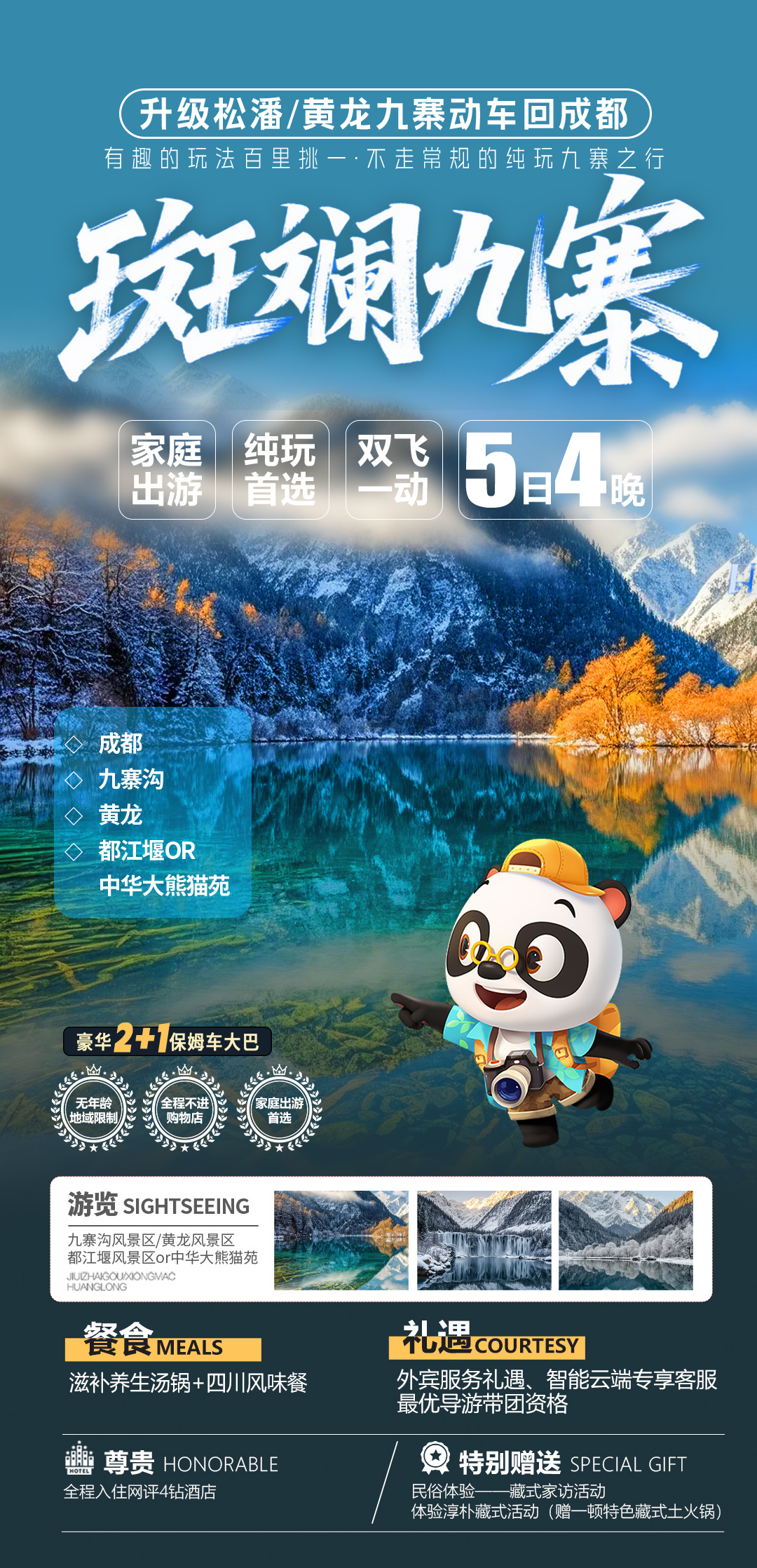 ①12月14日-次年3月31日全程优惠共退(九寨退0/黄龙退0/都江堰或熊猫乐园10),