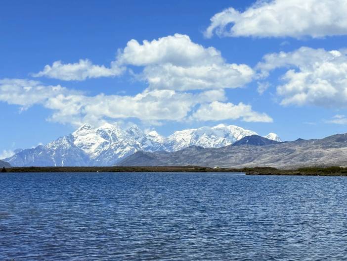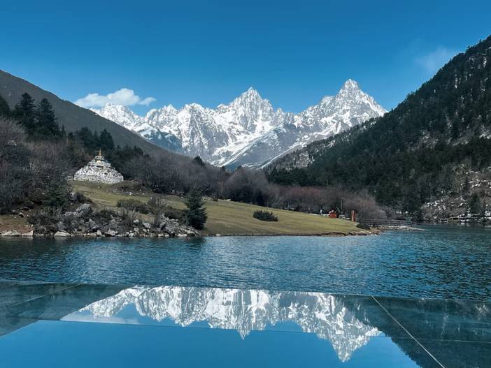 前往【红海子】游览雪山与湖泊同框、笔架峰倒映在湖面的绝美风景