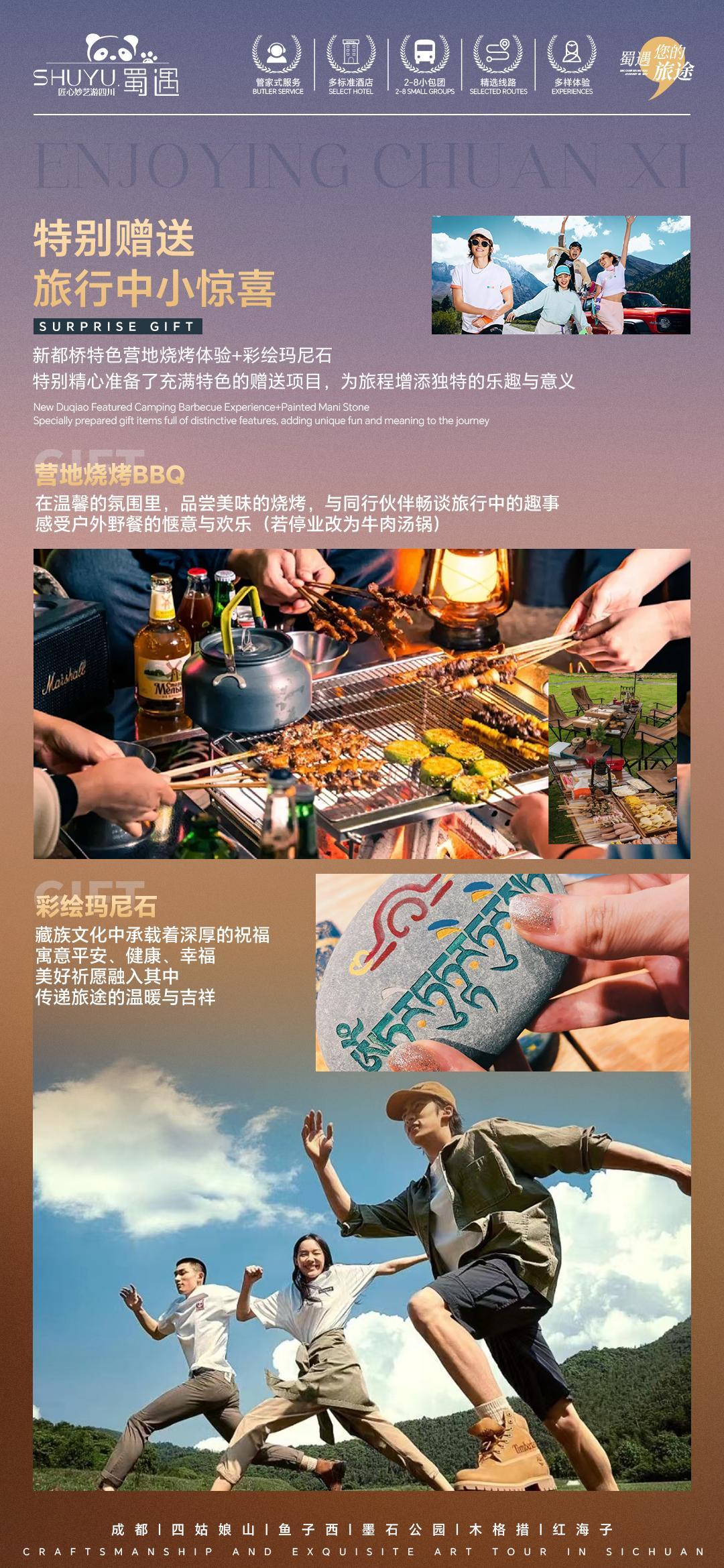 四姑娘山游览【双桥沟】观阴阳谷、人参果坪、沙 棘林栈道、盆景滩、撵鱼坝、四姑娜措、猎人峰、野人峰、布达拉峰、红杉林等景点, 双桥沟 景区开阔平坦、景点集中,全程通车。沟内以山景为主,沿沟 216 平方公里范围内,次第分布 着几十座海拔在 5000 米上的山峰,会同山涧溪流,如同徐徐展开的山水画廊。沟内还分布着 目前国内罕见的千年原始沙棘树林,以及平坦宽阔的高山草甸,夏季,各色花卉装簇其间,香 飘数里,漫步其中,宛若置身仙境。沟内现已开通绿色环保的观光车,游客可以更加舒适、方便的游览整个景区。
