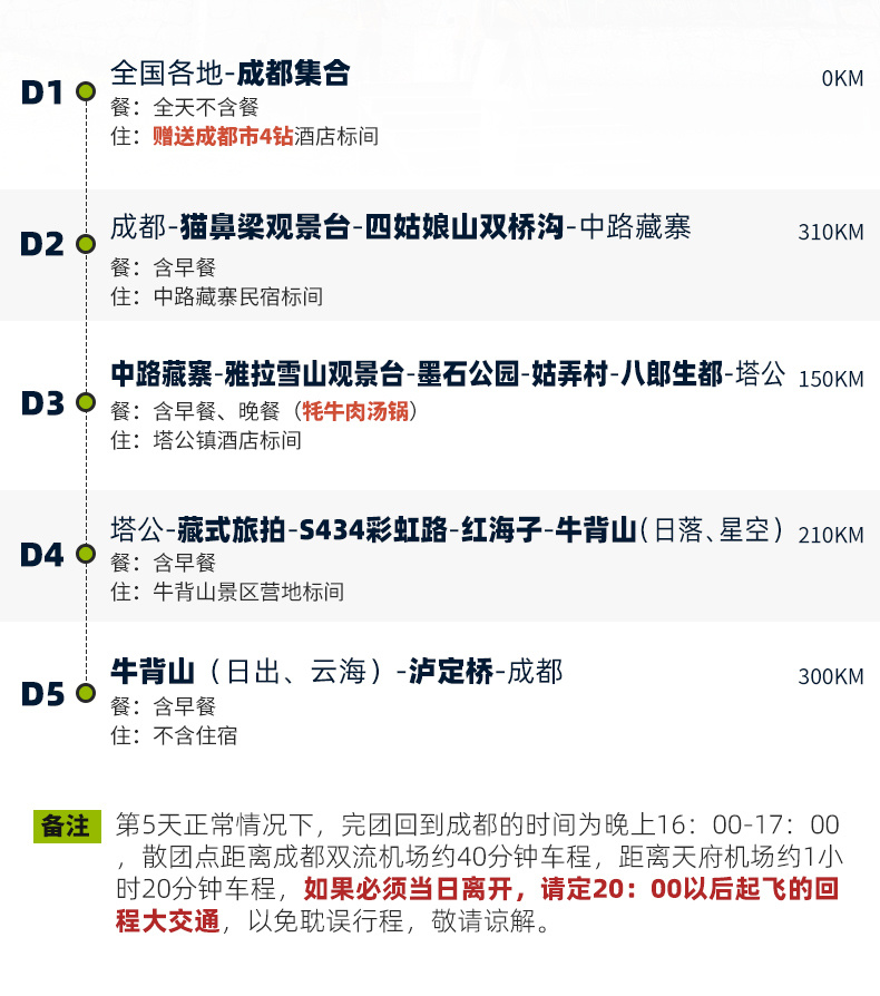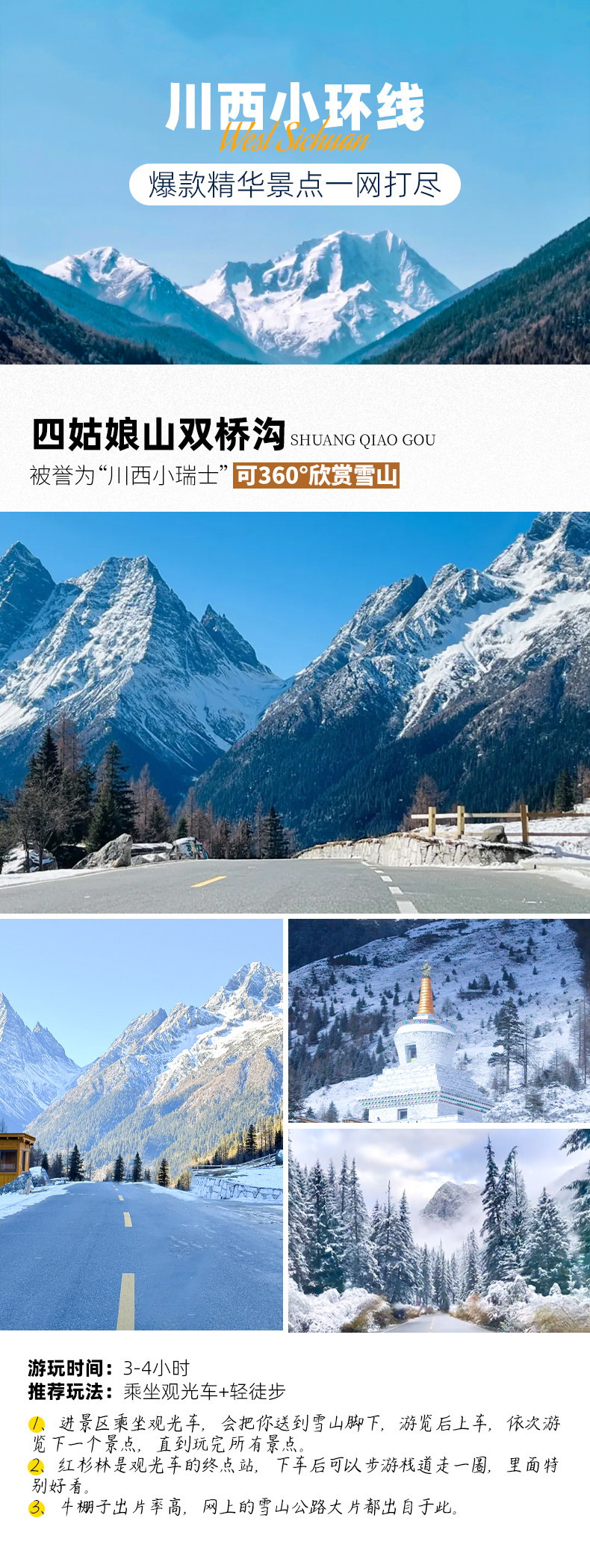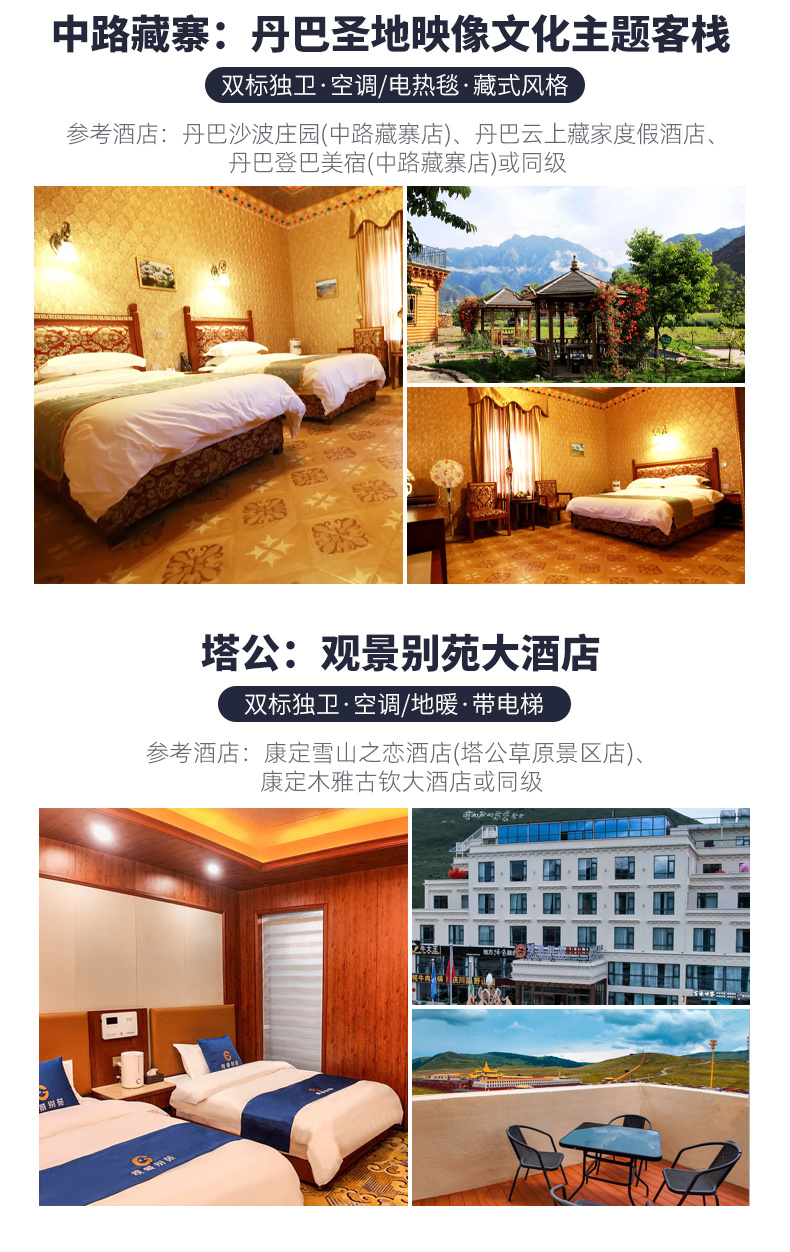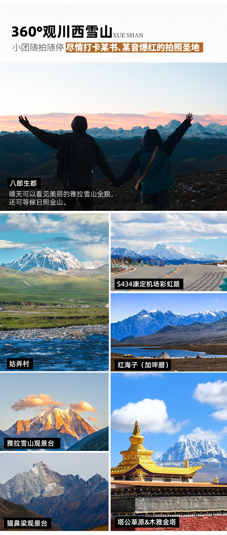 4、景交:四姑娘山双桥沟观光车70元/人(必须);墨石公园观光车20元/人(必须);泸定桥上桥保险5元/人(可选);牛背山转运车100元/人(可选),牛背山卡丁车单程140元/车/双人(可选),目前牛背山免观光车(如后续开始收费请自理);姑弄村、八郎生都、红海子、塔公草原等清洁费30-35元/人暂未收取,如产生需自理;