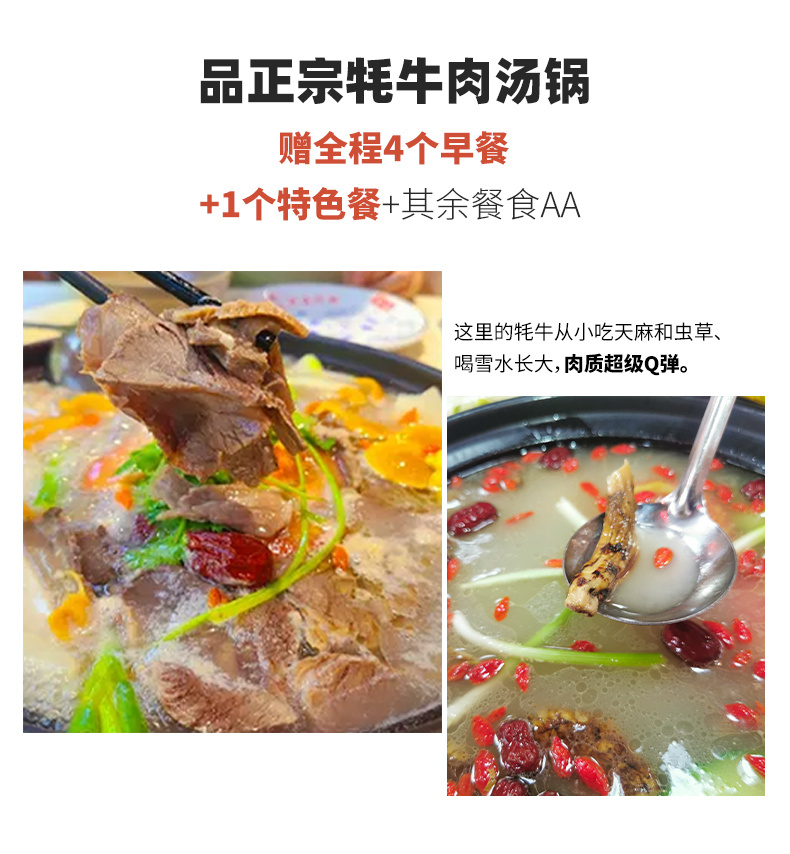 2、用餐:全程午餐、晚餐(第3天晚餐:牦牛肉汤锅除外)均不含,需自理(其余早餐为赠送,不用不退),大家可以一起AA,也可以单独用餐,工作人员的用餐团费当中已包含,不需另外支付;