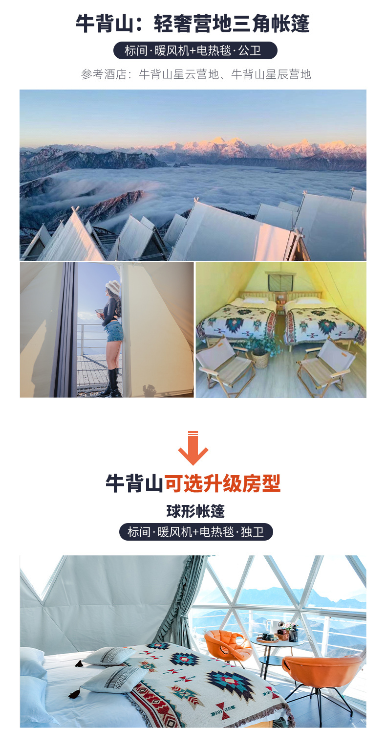 第16期春节特辑,3480元/人,单房差1300元/人,牛背山升级球形帐篷(独卫)/酒店(独卫)2人标准间,+350元/人。