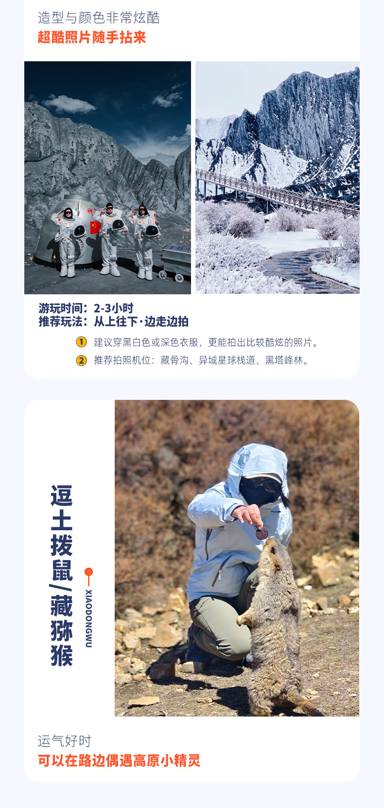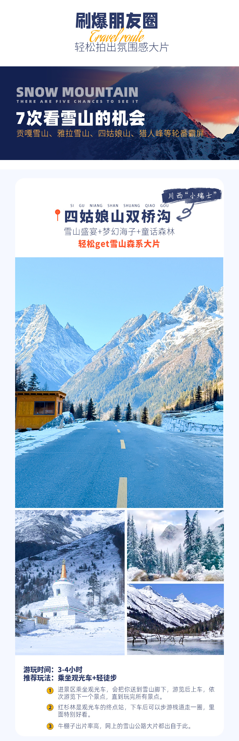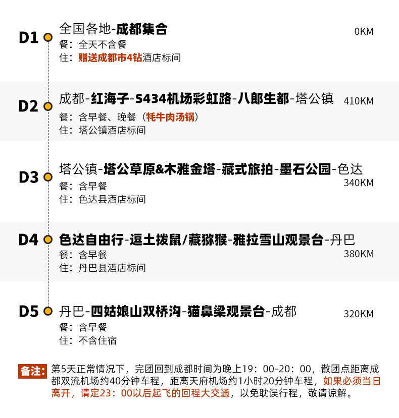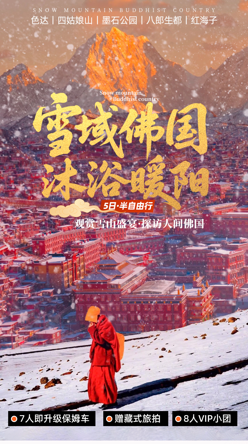 4、景交:四姑娘山双桥沟观光车70元/人(必须);墨石公园观光车20元/人(必须);红海子清洁费30元/人(可选);八郎生都清洁费30元/人(必须);色达乘车票48元/人,报名后请根据自己的游玩日期自行预约;