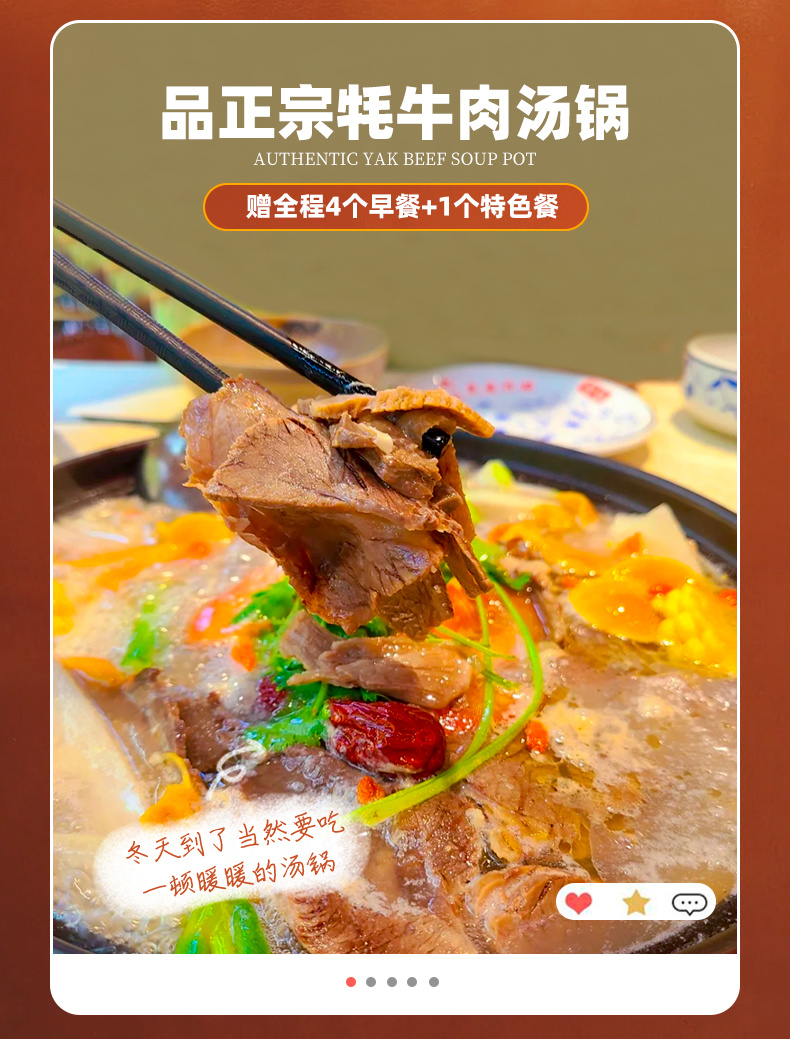3、全程4个早餐+1个特色餐(牦牛肉汤锅),如队员另外点餐,需自己支付费用;