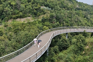 珠海景山道规划全长约10公里,东接景山公园和海滨公园,西至圆明新园,南倚九洲大道,北邻翠微东路和柠溪路。根据不同风景特色分为“串园”、“揽山”、“观海”三个主题段,自西向东串联起圆明新园、澳门回归公园、白莲洞公园、吉大水库、景山公园,直至城市阳台,是真正的通山达海、移步易景、慢行生态的无障碍特色步道,实现了山、海、城自然交融。