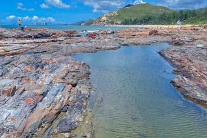 同时看到深蓝色的海水,黄色的沙滩和黑色的石头交织出的美丽图案